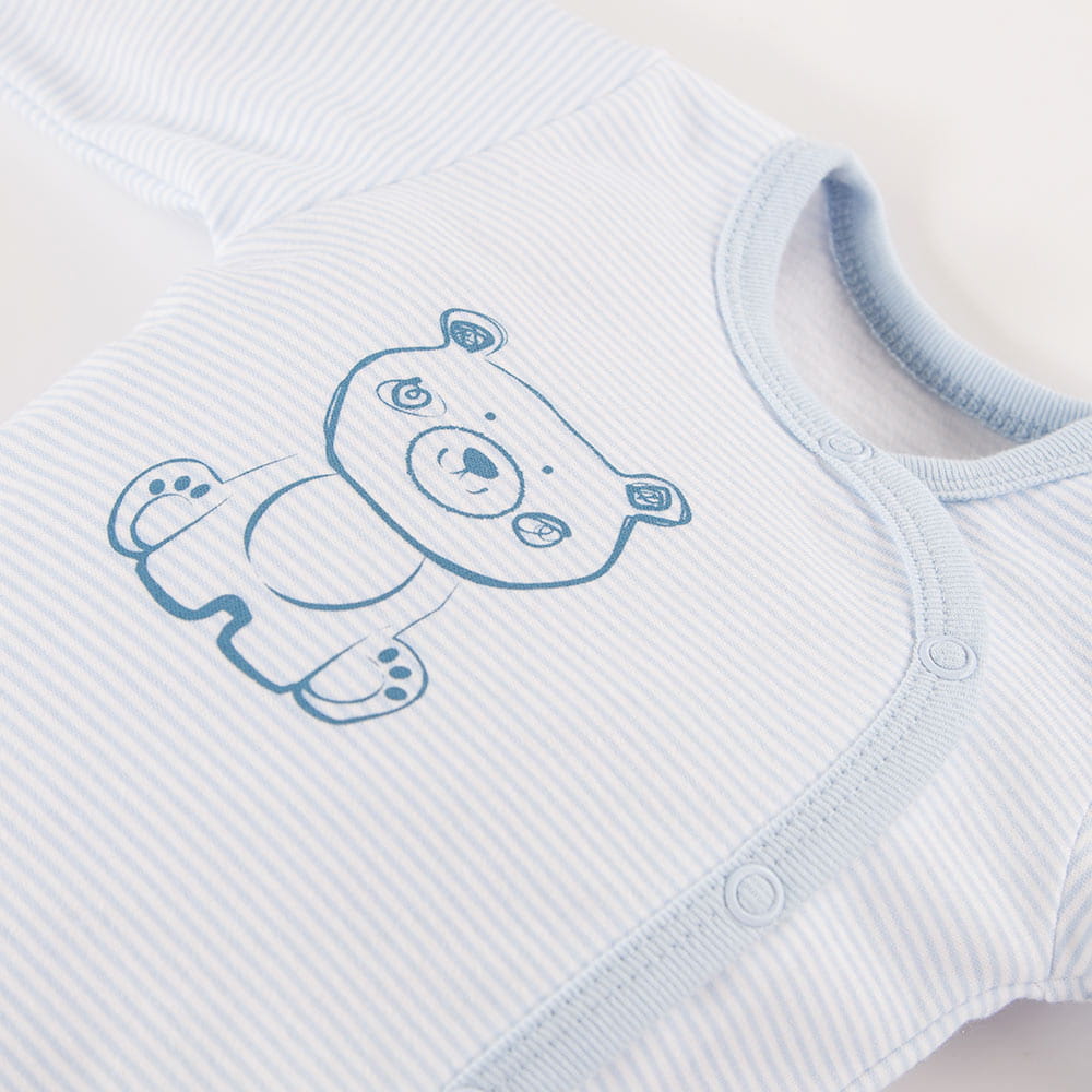 Das Modell verfügt über eine Druckknopfleiste über die gesamte Länge, wodurch das Anziehen und Wickeln des Babys deutlich einfacher wird – besonders in den ersten Lebensmonaten. Lange Ärmel sorgen für zusätzlichen Komfort und Wärme.