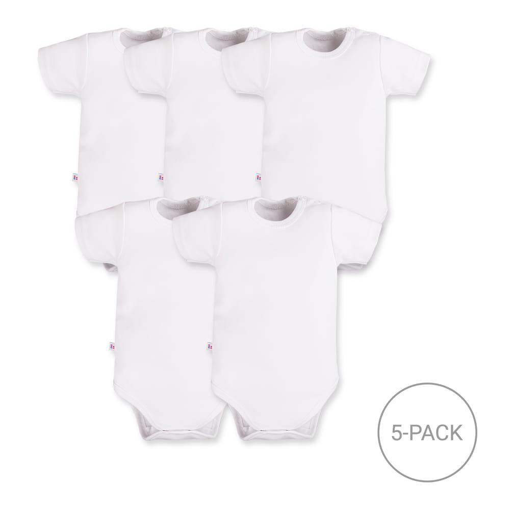 5er-Pack Babybodys zum Überziehen mit kurzen Ärmeln ist eine praktische und wirtschaftliche Wahl für den Alltag Ihres Babys. Das Set enthält fünf weiße Bodys aus 100% weicher, natürlicher Baumwolle, die Komfort, Atmungsaktivität und Sicherheit bereits ab den ersten Lebenstagen gewährleisten.