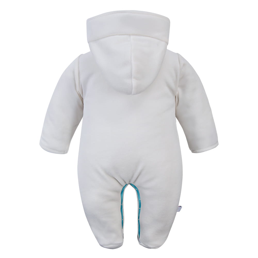 Der Overall besteht aus weichem und angenehm zu tragendem Velours. Das Baumwollfutter sorgt für Komfort und Sicherheit der empfindlichen Babyhaut, während die leichte Füllung eine optimale Wärmeisolierung gewährleistet.