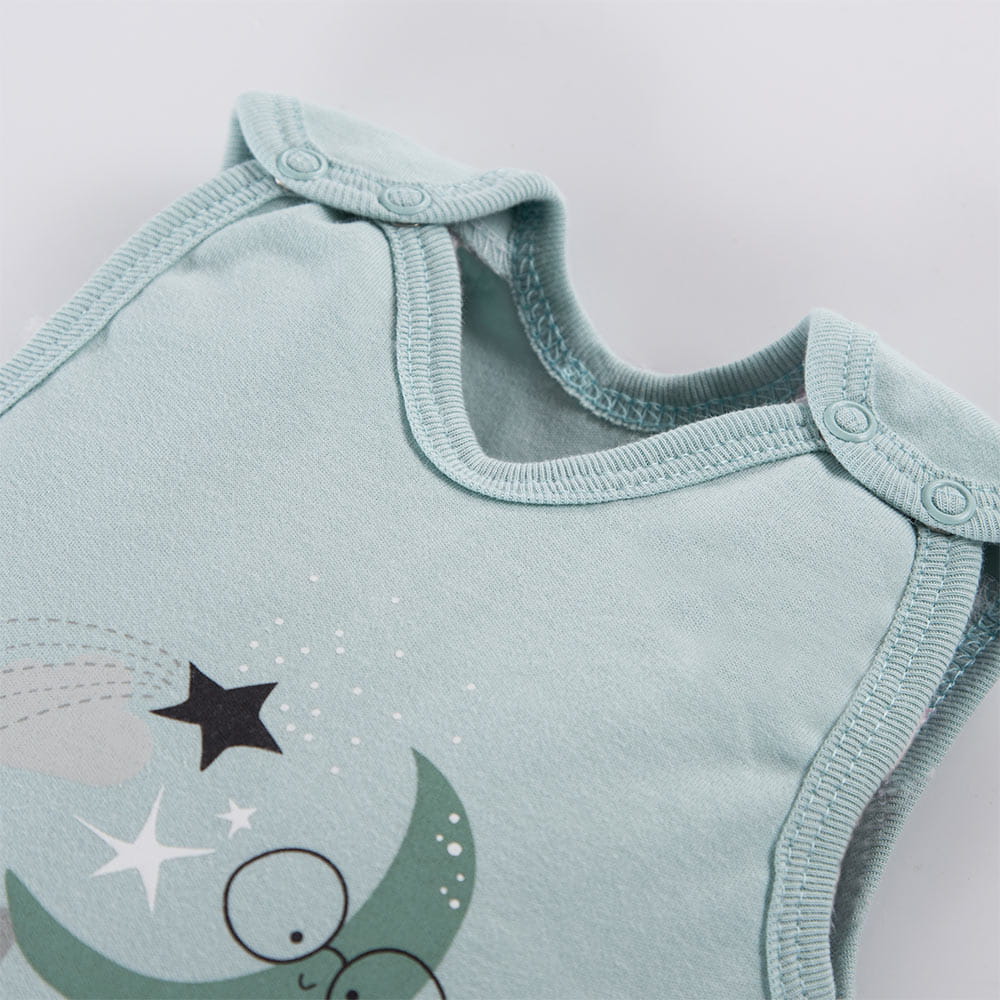 Mintfarbene Baby-Strampler aus der Mellow-Kollektion bestehen aus weichem, angenehm zu tragendem Baumwollstrick, der Komfort und Sicherheit für empfindliche Babyhaut bietet. Auf der Vorderseite befindet sich ein großer Faultieraufdruck. Der praktische Schnitt ermöglicht ein vollständiges Öffnen, wodurch der Strampler funktional und bequem ist. Die Kanten sind mit einem weichen Bund versehen. Trotz ihres Namens ziehen Eltern diese Strampler ihren Babys nicht nur zum Schlafen an. In Kombination mit einer passenden Strickjacke derselben Kollektion entsteht ein reizendes Outfit für Ausflüge.