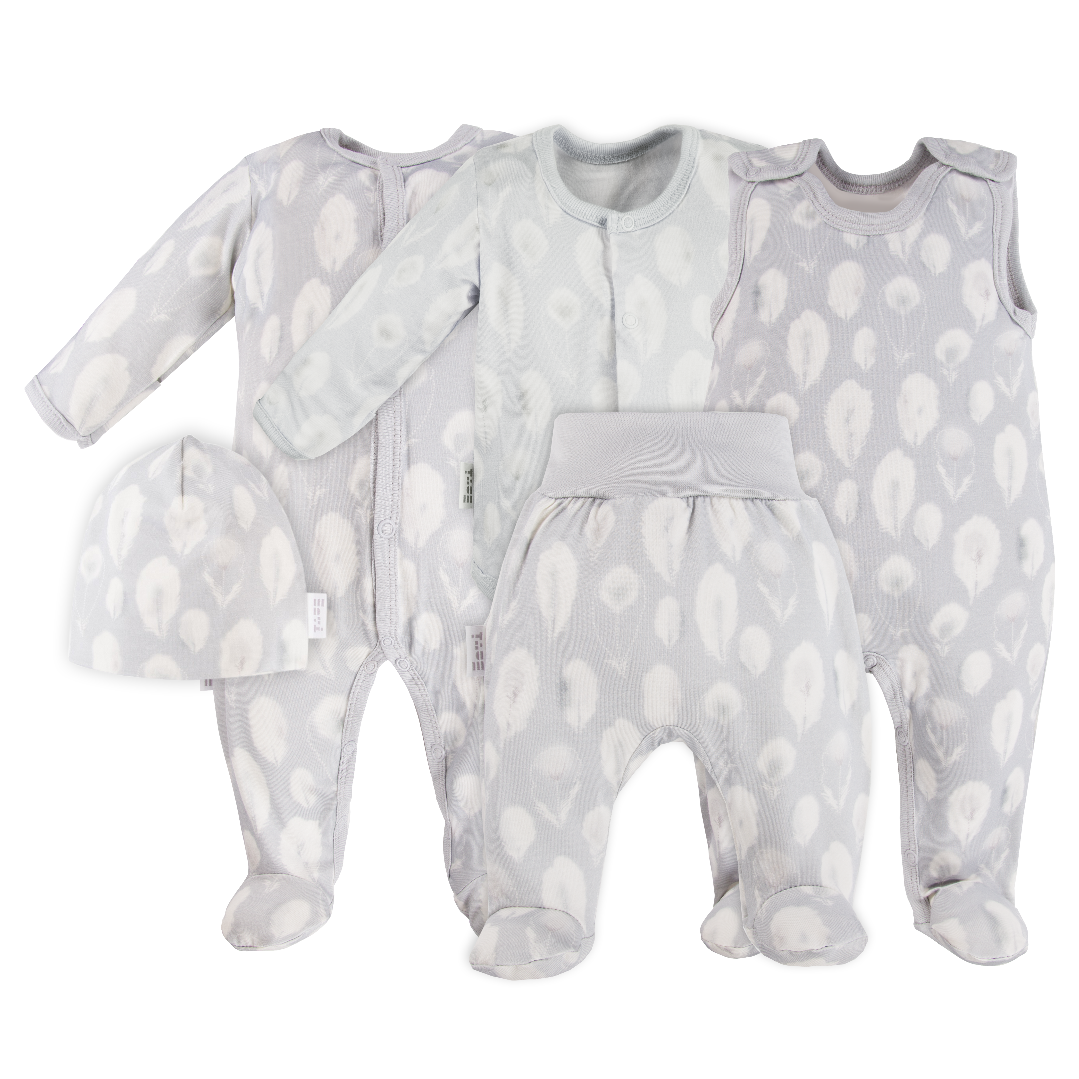 Baby-Set Schlafanzug, Strampler, Body, Mütze und Hose grau mit Federn