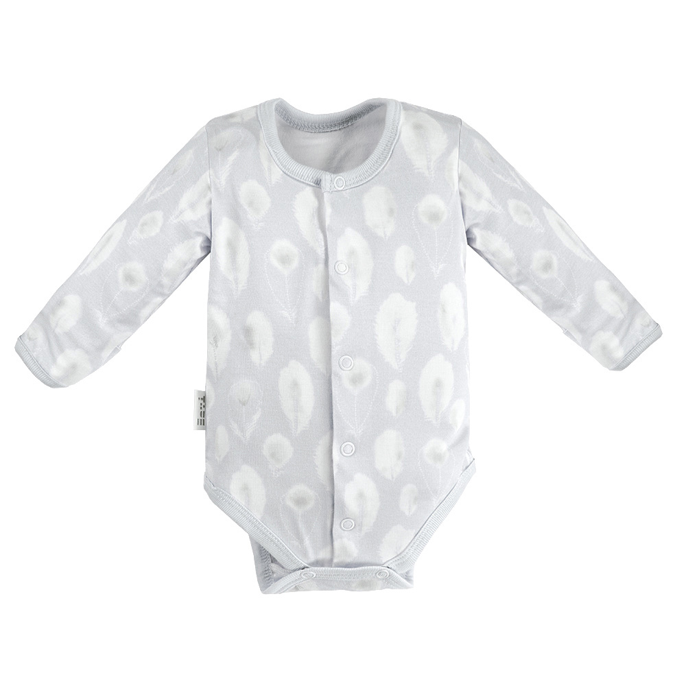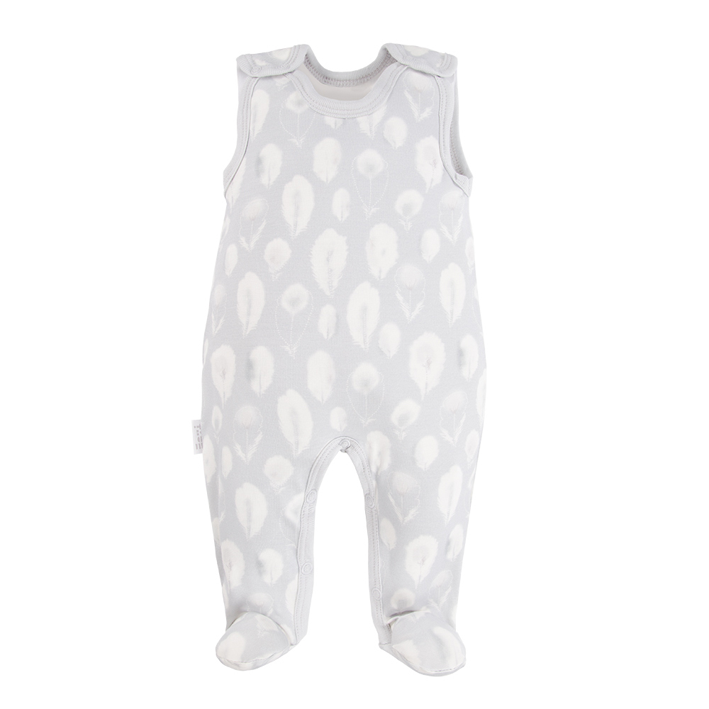 Das Set ist in Grau mit einem niedlichen Federmuster gehalten. Der Druck wurde digital erstellt, wodurch der Stoff besonders weich bleibt und das Muster nicht spürbar ist.