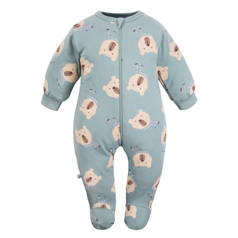 Strampler mit Füßchen in Salbei mit Bären – Kollektion Beary Cool Produktbeschreibung: Der Strampler aus der Kollektion Beary Cool ist die perfekte Wahl für Neugeborene und Babys ab den ersten Lebenstagen. Er ist aus weicher, atmungsaktiver Baumwolle in der trendigen Farbe Salbei mit Bärenprint gefertigt. Dank der integrierten Füßchen sorgt er für zusätzliche Wärme und Komfort. Der durchgehende Reißverschluss erleichtert das schnelle Umziehen des Babys – sogar im Schlaf. Warum sollten Sie sich für Baby-Strampler von Eevi entscheiden? 100 % hochwertige Baumwolle – weich, hautfreundlich, sicher vom ersten Lebenstag an. Füßchen zum Schutz vor Auskühlung – ideal für kühlere Tage. Funktionaler Reißverschluss – einfaches An- und Ausziehen, ohne den Kopf zu bedecken. Dezentes Bärenmotiv – einzigartiges Design aus der Beary Cool-Kollektion. Größen von 56 bis 68 – für Kinder von 0 bis 6 Monaten. Das Produkt wurde in Polen mit Liebe zum Detail entworfen und genäht. Sicherheit und Qualität. Alle Kleidungsstücke von Eevi werden mit Rücksicht auf die empfindliche Haut des Kindes hergestellt. Wir verwenden nur sichere Stoffe sowie vernickelte Druckknöpfe und Reißverschlüsse. Der Strampler erfüllt strenge Qualitätsstandards und verfügt über folgende Zertifikate: „Sicher für Kinder” „Sicher für Säuglinge” Produktdetails: Kollektion: Beary Cool Farbe: Salbei mit Bärenaufdruck Material: 95 % Baumwolle, 5 % Elasthan Materialart: Strickware Ärmel: Lang Verschluss: Durchgehender Reißverschluss Schnitt: Mit Füßchen Größen: 56, 62, 68 Pflege: Waschen bei 40 °C, nicht im Wäschetrockner trocknen Herkunft: 100 % polnisches Produkt Komfort und Sicherheit für jeden Tag Mit den Stramplern von Eevi können Sie sicher sein, dass Ihr Kind bequem, sicher und stilvoll gekleidet ist. Dieses Modell mit Füßchen ist die perfekte Wahl für die Nacht, den Mittagsschlaf und die täglichen Aktivitäten Ihres Babys. Bestellen Sie jetzt und sorgen Sie dafür, dass Ihr Kind jeden Tag warm und bequem gekleidet ist!