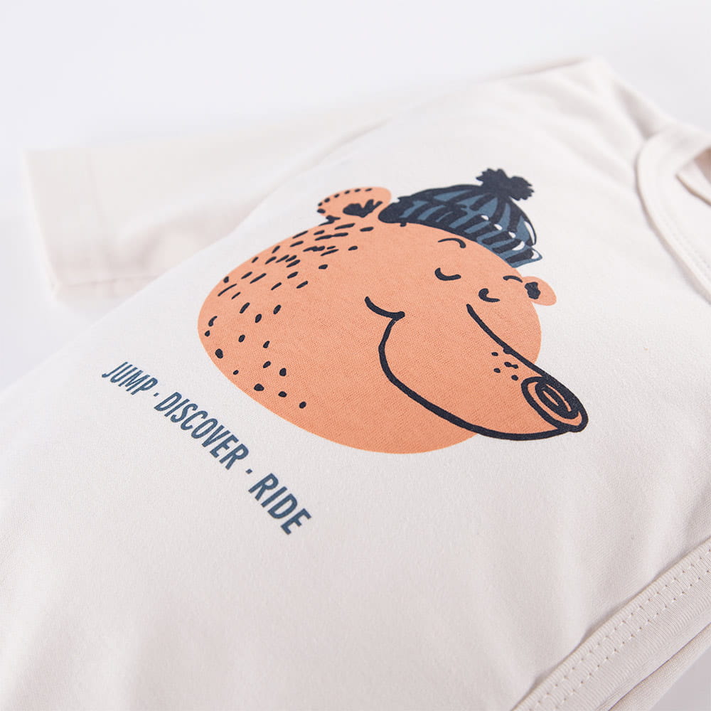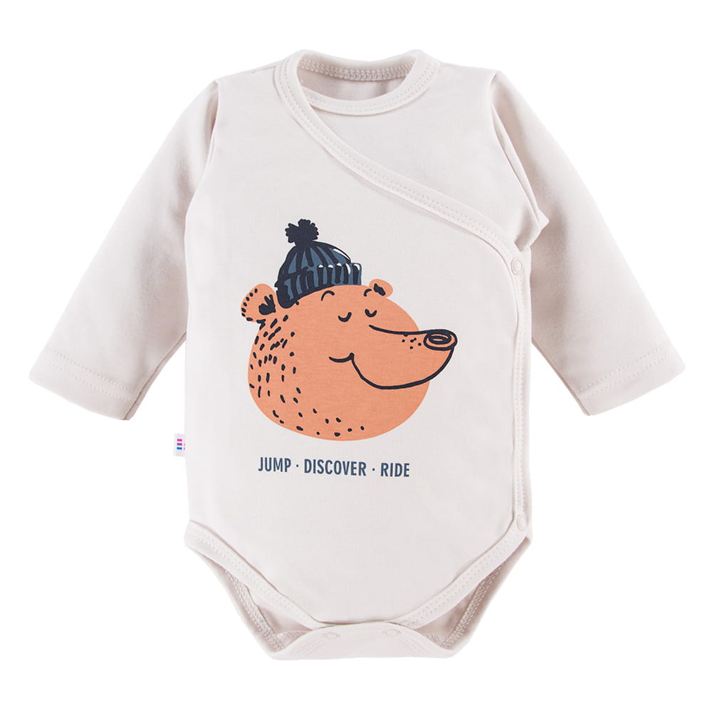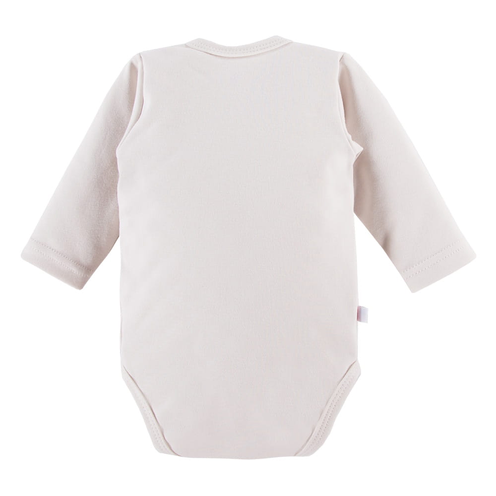 Ecrufarbener Wickelbody mit Umschlag und Teddybär. Der Wickelbody ist ideal für Kinder bis zu 3 Jahren. Mütter wählen meistens Body für ihre Kleinen. Sie sind ein Muss in jeder Baby- oder Kindergartenerstattung. Alter des Kindes: Von 0 bis 6 Monaten Kollektion: Jump Material: 100 % hochwertige Baumwolle Struktur/Art des Materials: Strickware Pflegehinweise: Maschinenwäsche bei 40 °C, nicht im Wäschetrockner trocknen Muster: Farbe Ecru – mit Teddybär Ärmel: Langarm Verschluss: Wickelverschluss Verarbeitung: Weiche Paspel Herkunft: 100 % polnisches Produkt Zertifikate: „Sicher für Kinder”, „Sicher für Babys” Die Babykleidung von Eevi wird mit Blick auf den Komfort und die Sicherheit der Haut Ihres Kindes hergestellt. Warum vertrauen wir der Marke Eevi seit Jahren so sehr? Die Produkte werden mit Sorgfalt und unter Verwendung von Materialien höchster Qualität genäht. Bei der Herstellung von Babykleidung verwenden wir ausschließlich ökologische Farben, die für die Haut von Kindern und Babys unbedenklich sind. Die Stickereien in unseren Produkten sind von innen gesichert, damit sie die empfindliche Haut des Kindes nicht reizen. Alle Druckknöpfe und Verschlüsse, die wir in unseren Produkten verwenden, sind nickelfrei.