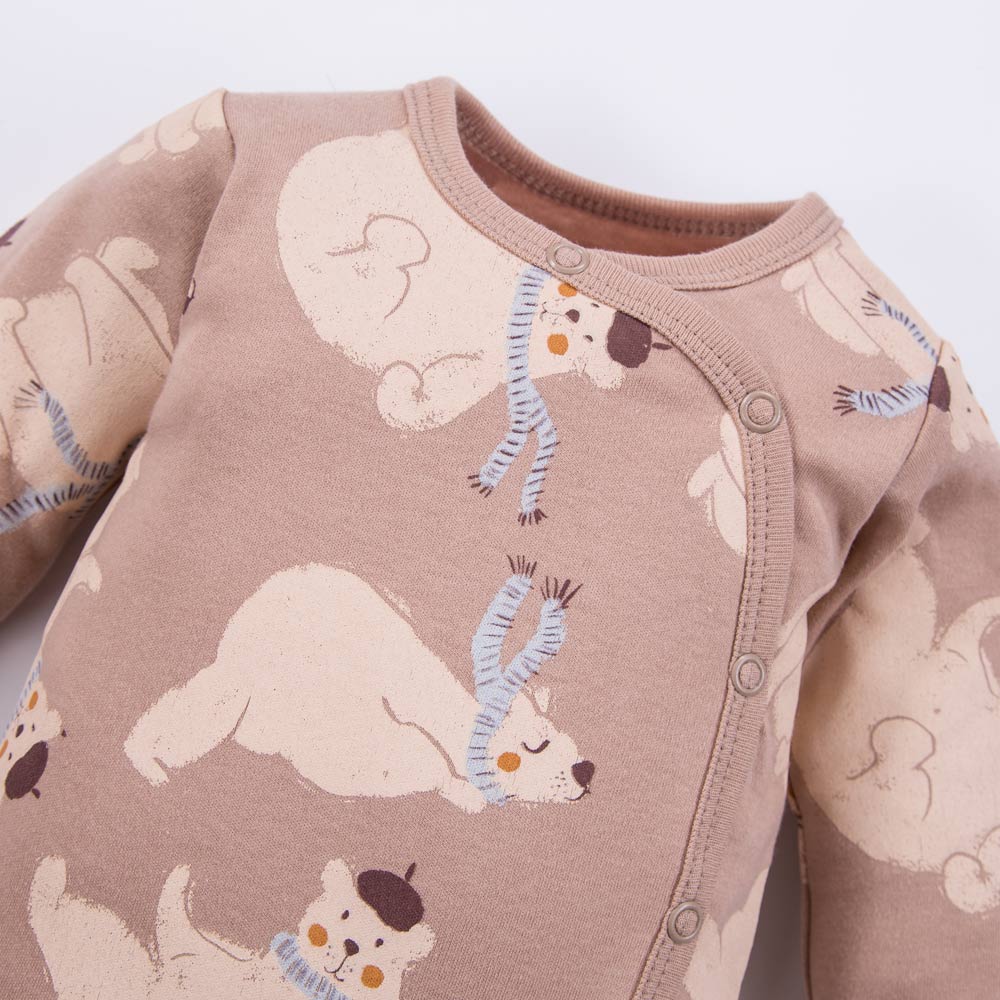 Beigefarbene Baby-Wickelbody mit Umschlagausschnitt und Bärenmotiv