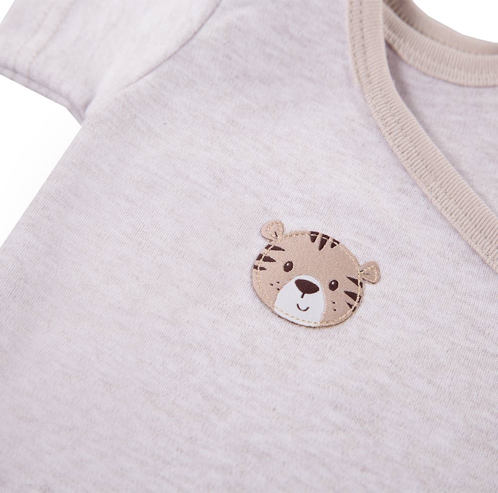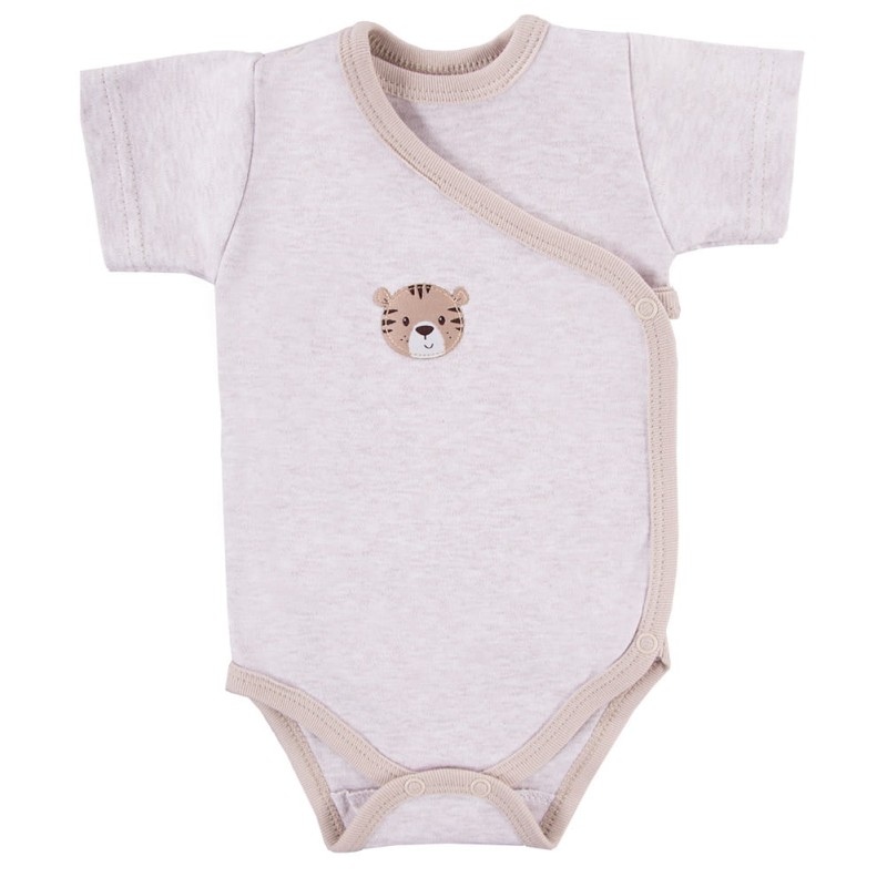 Beiger Wickelbody mit kurzen Ärmeln aus der Kollektion „Baby Love“, genäht aus weichem und angenehm anzufassendem meliertem Baumwollstrick. Auf der Vorderseite des Wickelbody befindet sich ein niedlicher Aufnäher mit einem Tiermotiv. Der Schnitt ermöglicht ein vollständiges Aufknöpfen, wodurch der Body funktional und bequem ist. Der Body ist mit einem weichen Saum versehen. Babybodys eignen sich ideal für die ersten Lebensmonate des Kindes und gehören zu den von Müttern am häufigsten gewählten Artikeln. Die Babykleidung von Eevi wird mit Sorgfalt für den Komfort und die Sicherheit der Haut Ihres Kindes hergestellt. Warum vertrauen Mütter seit Jahren der Marke Eevi? Die Produkte werden mit Sorgfalt und unter Verwendung von Materialien höchster Qualität genäht. Bei der Herstellung von Babykleidung verwenden wir ausschließlich ökologische Farben, die für die Haut von Kindern und Babys unbedenklich sind. Die Stickereien in unseren Produkten sind von innen gesichert, damit sie die empfindliche Haut des Kindes nicht reizen. Alle Druckknöpfe und Verschlüsse, die wir in unseren Produkten verwenden, sind nickelfrei. Die von uns angebotenen Bodys sind zertifiziert: „Sicher für Kinder” „Sicher für Babys” Material: 100 % hochwertige Baumwolle Alter des Kindes: 0 bis 6 Monate PRODUKT 100 % POLNISCH