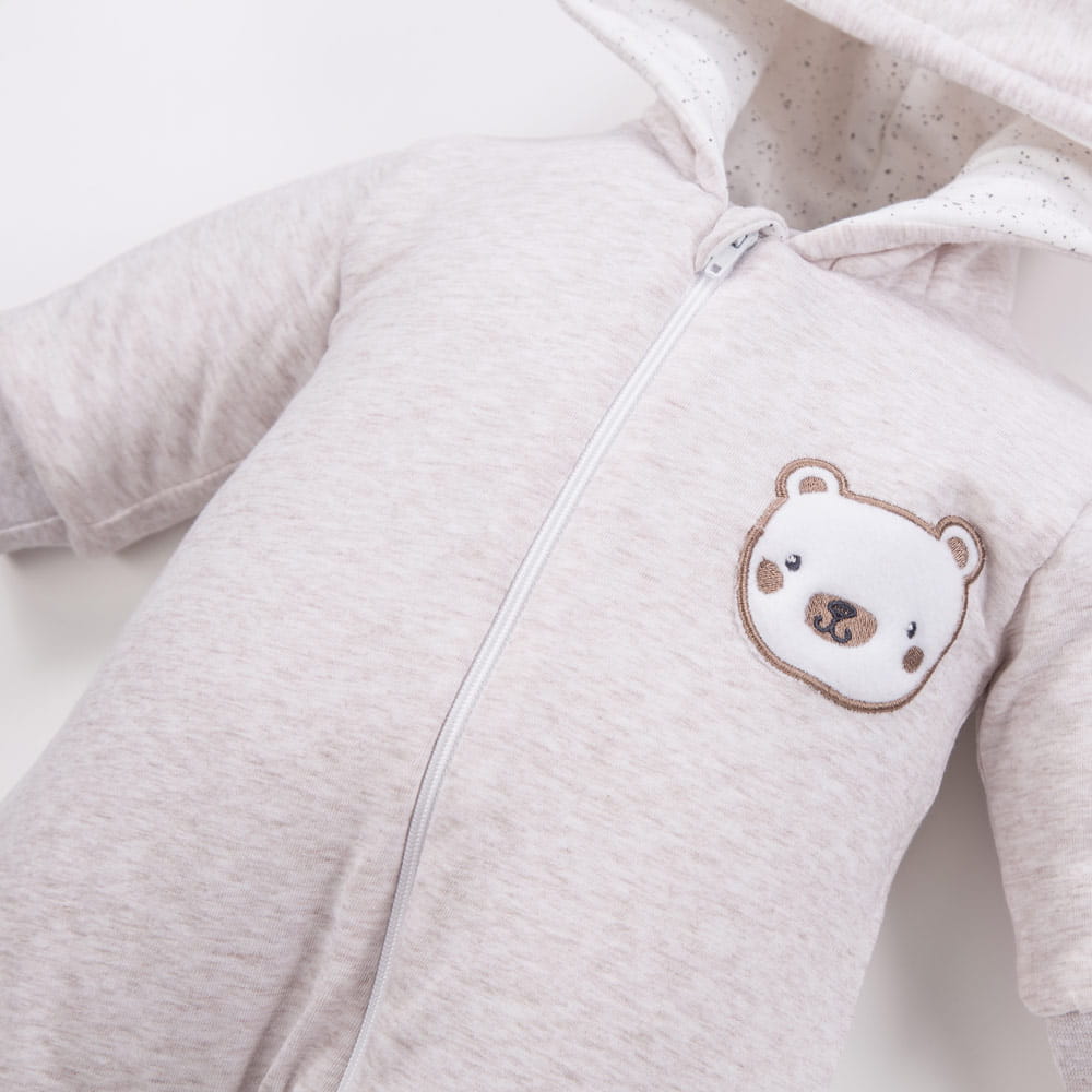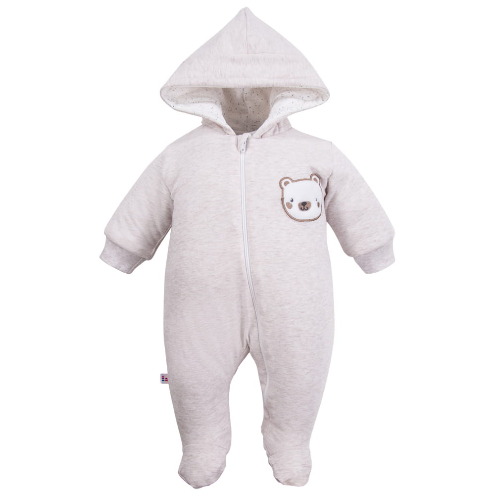 Beigefarbener Babyoverall mit Kapuze und Teddybär