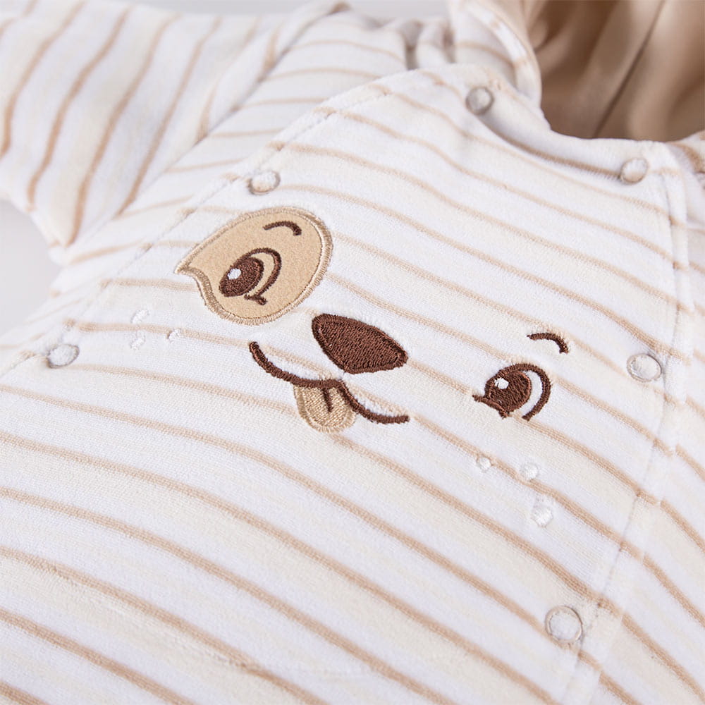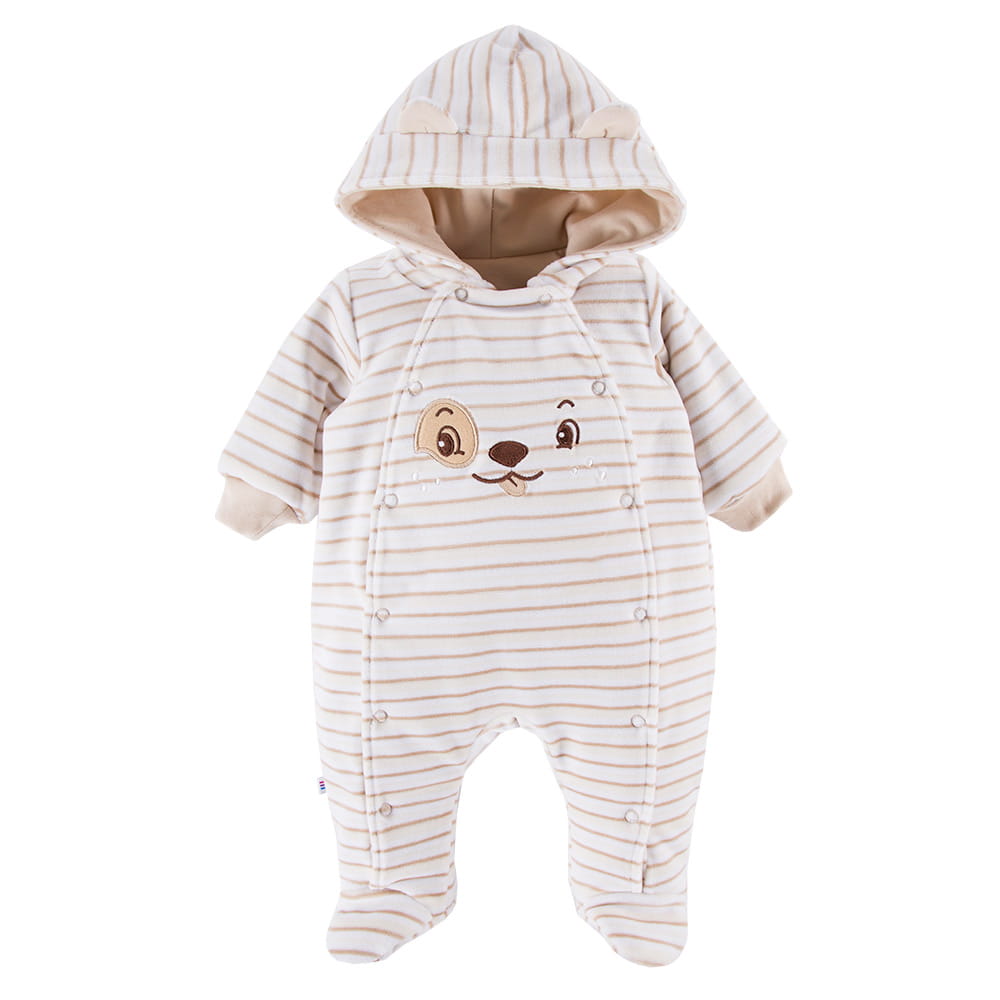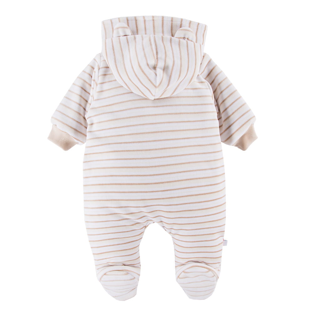 Beiger Overall aus warmem Velours. Der Overall hat eine Kapuze und niedliche Ohren. Das Futter des Overalls besteht zu 100 % aus Baumwolle. Der Strampler mit Kapuze ist ideal für den Krankenhausaufenthalt in den kalten Monaten. Er ist ein Muss in der Babyausstattung für Kinder, die im Winter und Herbst geboren werden. Alter des Kindes: 0 bis 9 Monate Kollektion: RUN&FUN Material: Obermaterial: 80 % Baumwolle, 20 % Polyester, Futter: 100 % hochwertige Baumwolle, Füllung: 100 % Polyester Struktur/Materialart: Strickware Pflegehinweise: Maschinenwäsche bei 40 °C, nicht im Wäschetrockner trocknen Muster: Gestreift – beige, ecru Verschluss: Druckknöpfe Verarbeitung: Tierstickerei Herkunft: 100 % polnisches Produkt Zertifikate: „Sicher für Kinder”, „Sicher für Babys” Die Babykleidung von Eevi wird mit Blick auf den Komfort und die Sicherheit der Haut Ihres Kindes hergestellt. Warum vertrauen wir der Marke Eevi seit Jahren so sehr? Die Produkte werden mit Sorgfalt und unter Verwendung von Materialien höchster Qualität genäht. Bei der Herstellung von Babykleidung verwenden wir ausschließlich ökologische Farben, die für die Haut von Kindern und Babys unbedenklich sind. Die Stickereien in unseren Produkten sind von innen gesichert, damit sie die empfindliche Haut des Kindes nicht reizen. Alle Druckknöpfe und Verschlüsse, die wir in unseren Produkten verwenden, sind nickelfrei.