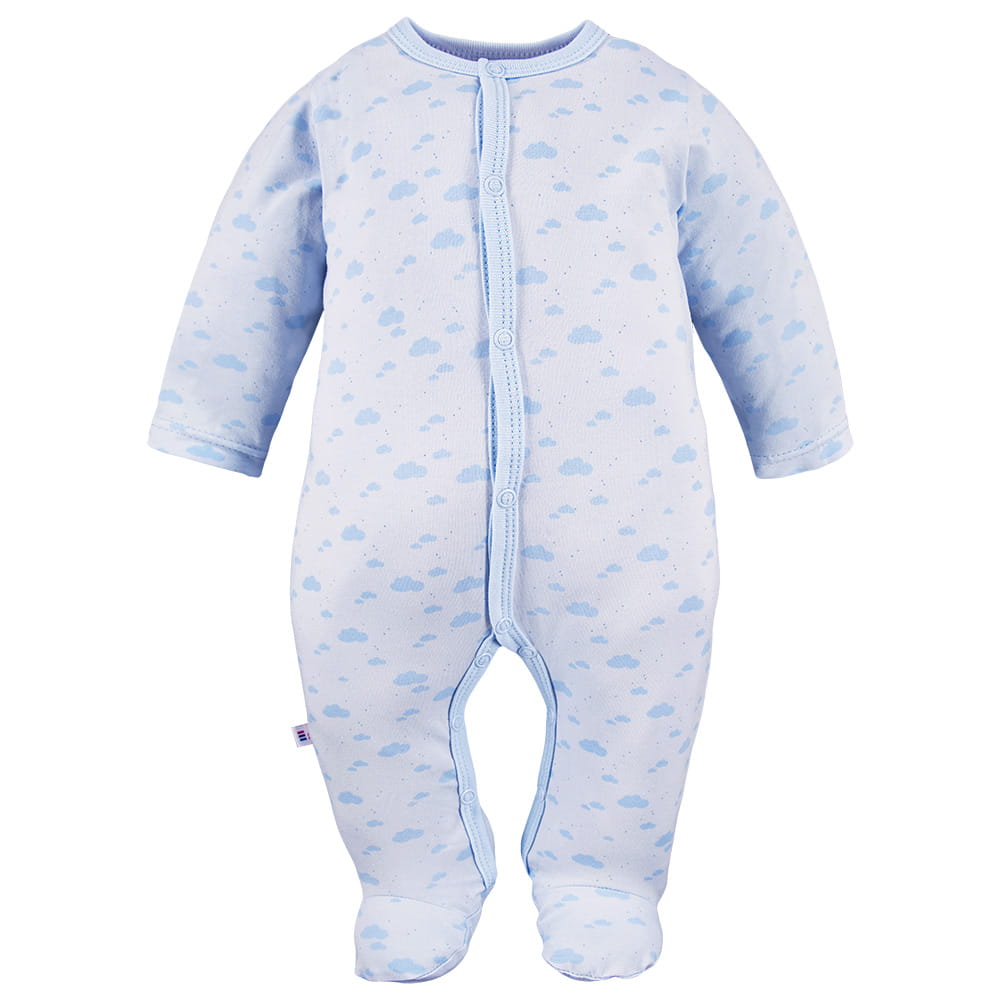 Blauer Babystrampler mit Wolkenmuster aus weichem, angenehm zu berührendem elastischem Baumwollstrick. Der Zusatz von Elastan und das durchgehende Verschließen sorgen für Komfort beim Anziehen. Der universelle Schnitt schützt den ganzen Körper, spendet Wärme und Bewegungsfreiheit. Ideal für die ersten Lebensmonate als Tageskleidung oder gemütlicher Schlafanzug.
