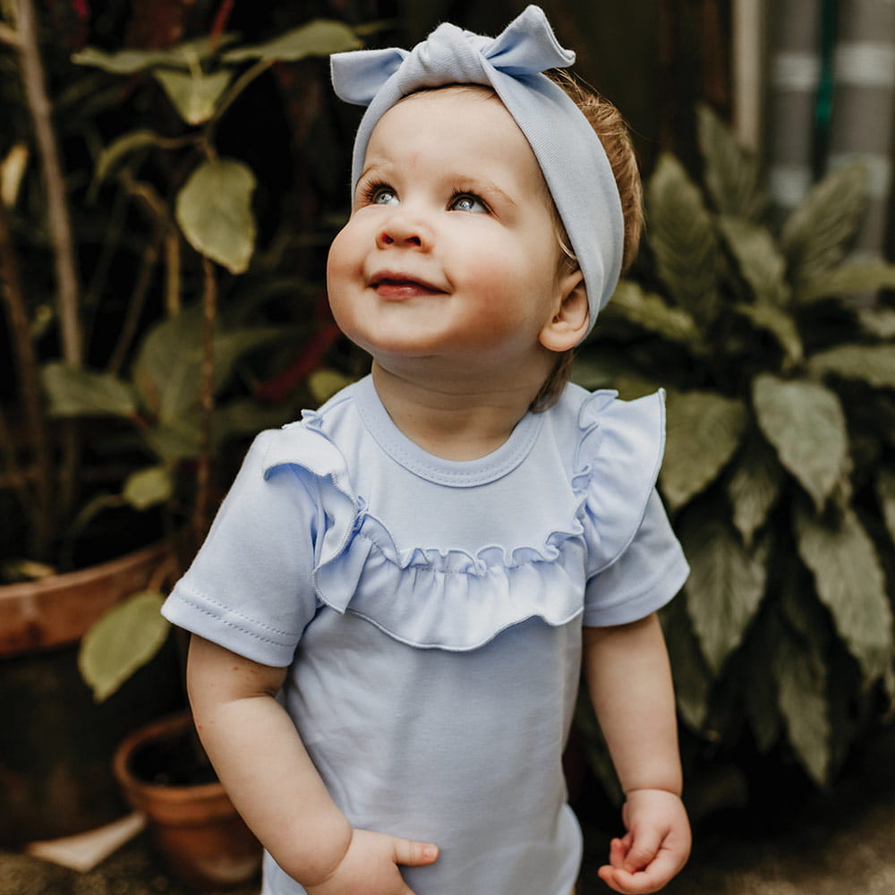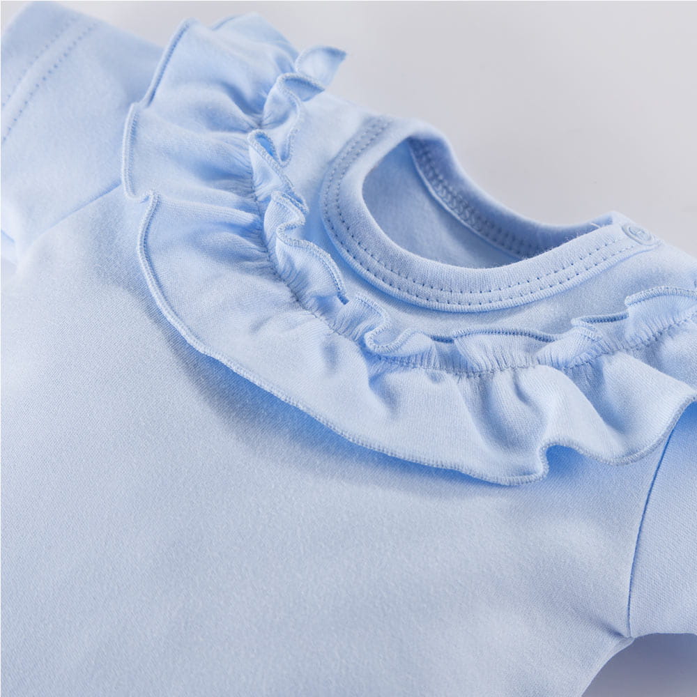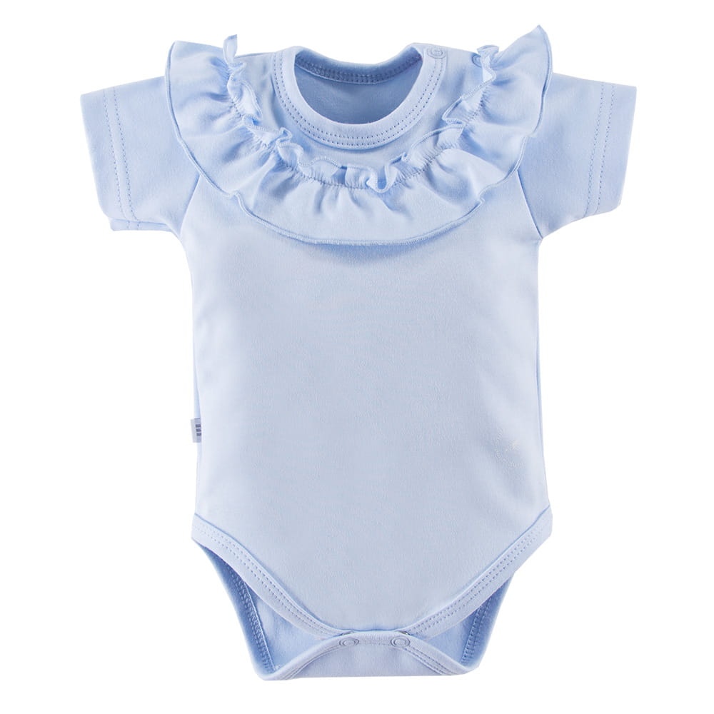 Blauer Babybody mit Rüschen. Babybodys eignen sich ideal für Kinder bis zu 3 Jahren. Mütter wählen meist Bodys für ihre Kleinen. Sie sind ein Muss in jeder Baby- oder Kindergartenerstattung. Alter des Kindes: Von 7 Monaten bis 3 Jahren Kollektion: Botanic Material: 100 % hochwertige Baumwolle Struktur/Materialart: Strickware Pflegehinweise: Maschinenwäsche bei 40 °C, nicht im Wäschetrockner trocknen Muster: Farbe Blau. Ärmel: Kurzer Ärmel Verschluss: Am Schulterträger Verarbeitung: Weiche Paspelierung Herkunft: 100 % polnisches Produkt Zertifikate: „Sicher für Kinder”, „Sicher für Babys” Die Babykleidung von Eevi wird mit Blick auf den Komfort und die Sicherheit der Haut Ihres Kindes hergestellt. Warum vertrauen wir der Marke Eevi seit Jahren so sehr? Die Produkte werden mit Sorgfalt und unter Verwendung von Materialien höchster Qualität genäht. Bei der Herstellung von Babykleidung verwenden wir ausschließlich ökologische Farben, die für die Haut von Kindern und Babys unbedenklich sind. Die Stickereien in unseren Produkten sind von innen gesichert, damit sie die empfindliche Haut des Kindes nicht reizen. Alle Druckknöpfe und Verschlüsse, die wir in unseren Produkten verwenden, sind nickelfrei.
