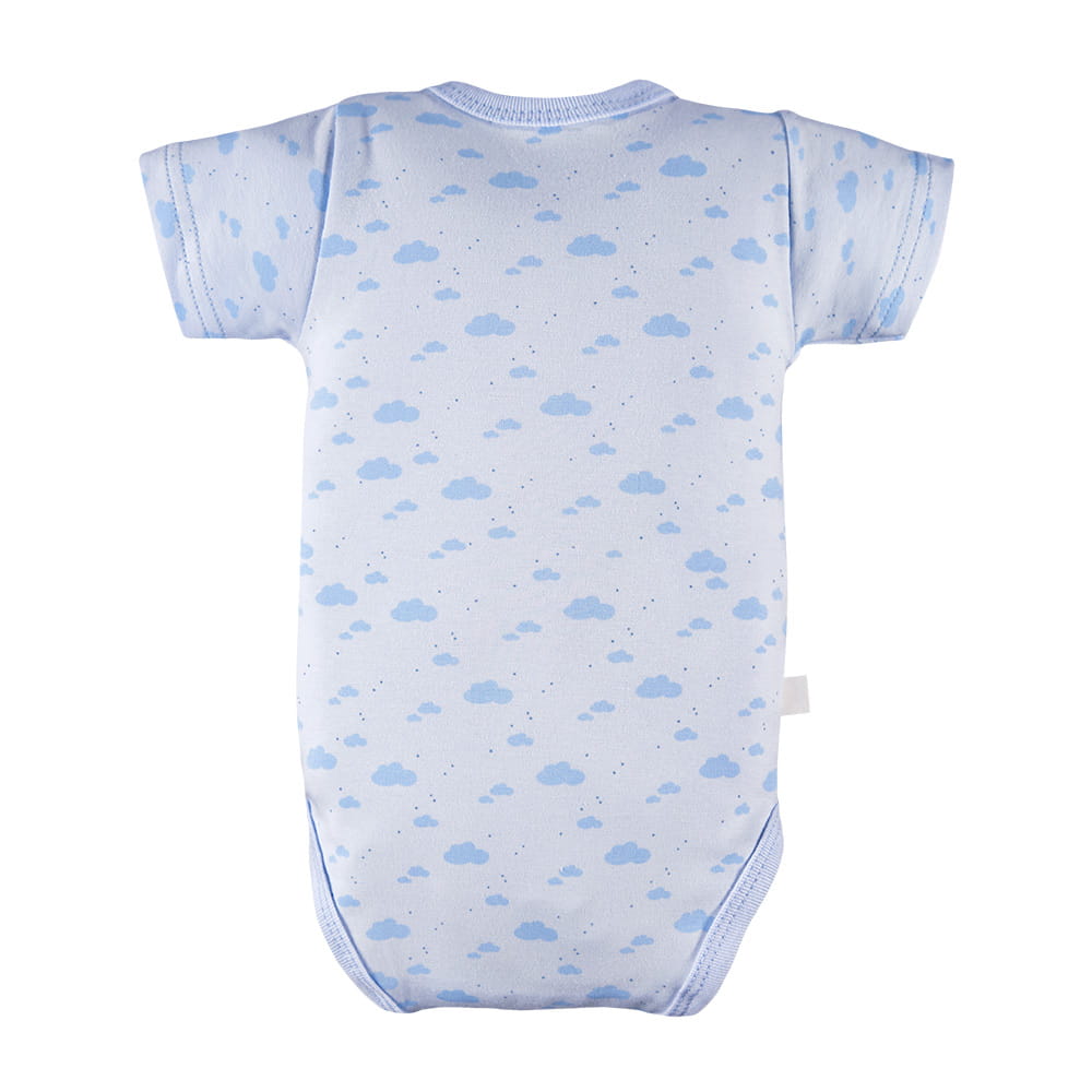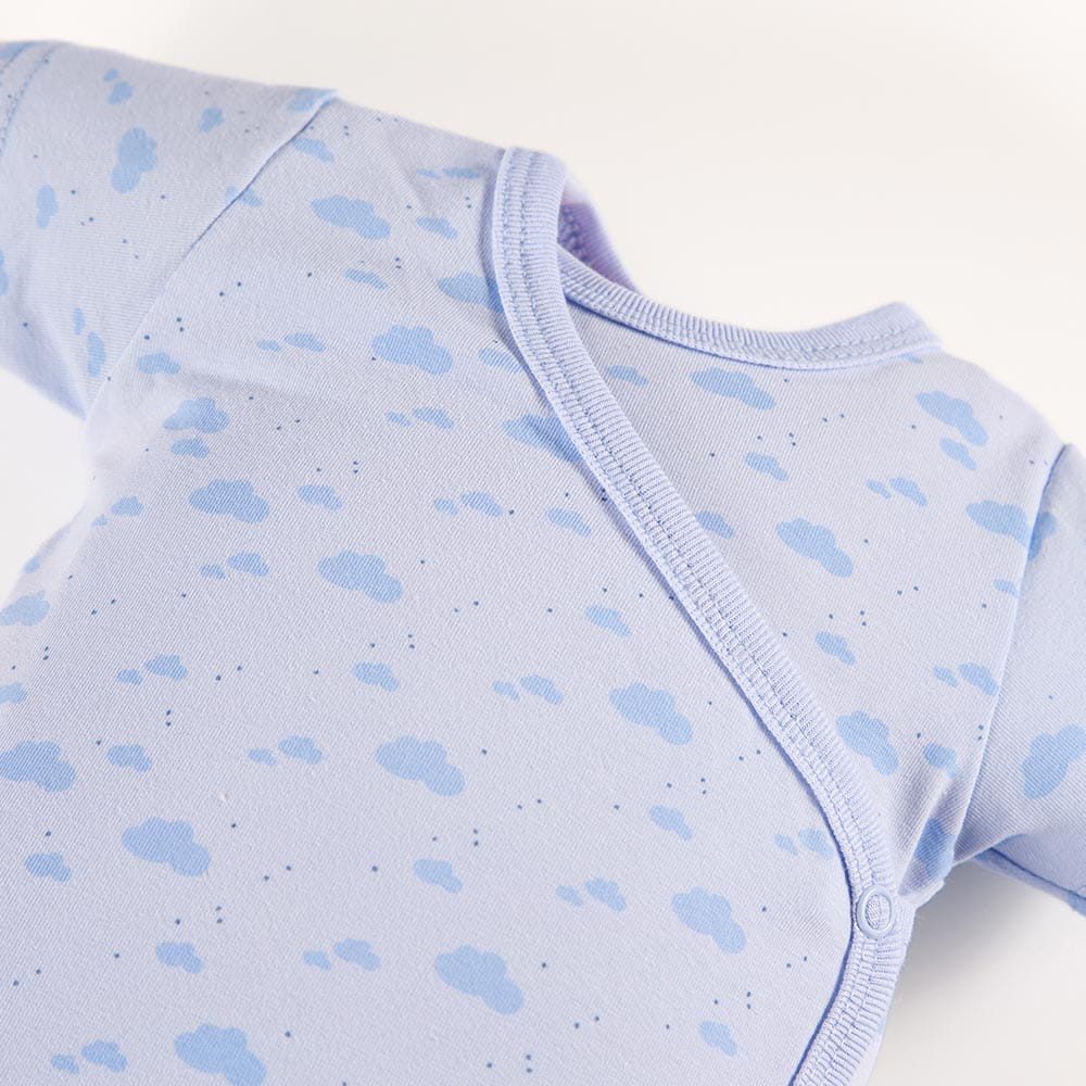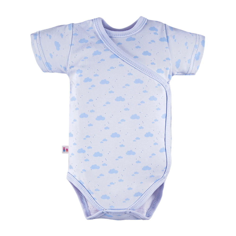 Blauer Wickelbody für Babys mit kurzen Ärmeln und Wolkenmuster ist eine bequeme und praktische Wahl für Säuglinge in den ersten Monaten. Das dezente Wolkenmuster verleiht dem Body einen subtilen, kindlichen Charme.