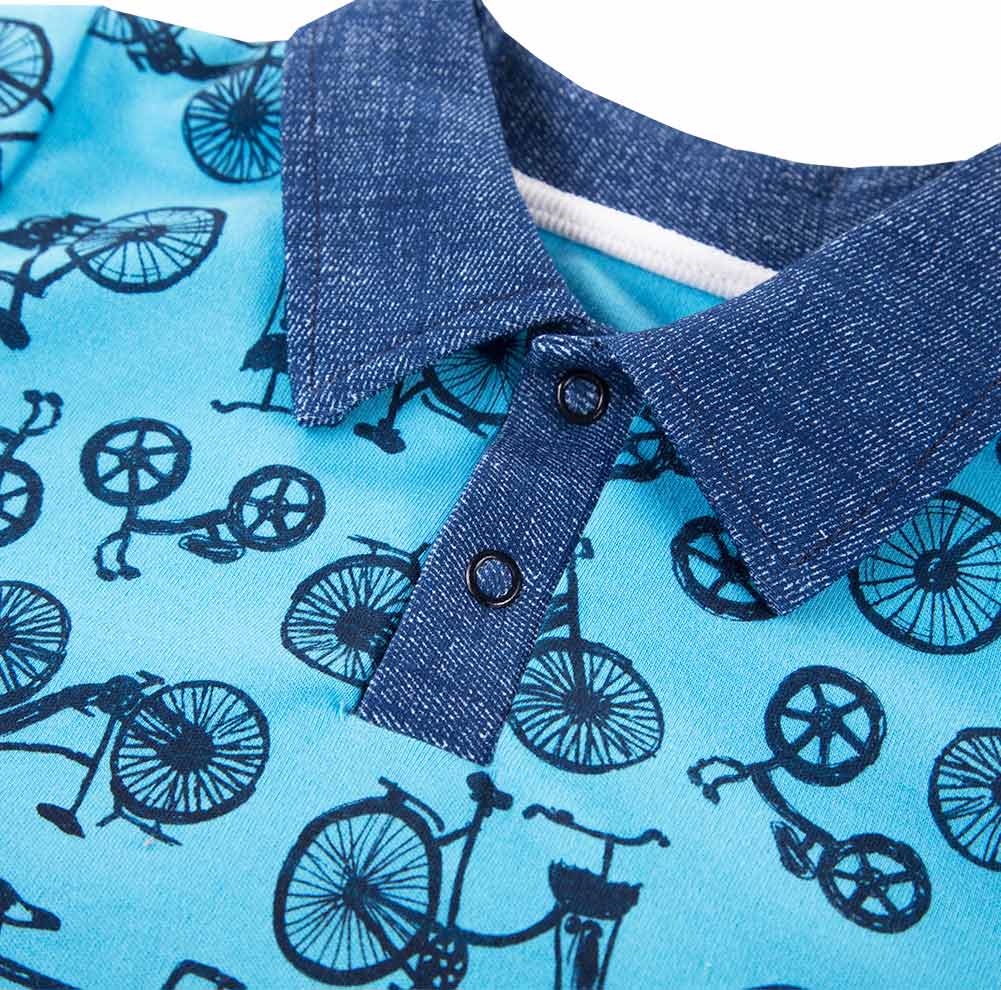 Kinder-T-Shirt-Polo aus der Kollektion „Bike”, hergestellt aus weichem und angenehmem Baumwollstoff. Das T-Shirt hat einen kontrastierenden blauen Kragen. Das Muster des Kinder-T-Shirts ist mit Fahrrädern bedruckt. Die T-Shirts eignen sich hervorragend für den Sommer oder Frühling, da sie luftig und aus Baumwolle gefertigt sind. Das T-Shirt lässt sich toll mit Latzhosen oder Shorts aus derselben Kollektion kombinieren. Die Babykleidung von Eevi wird mit Sorgfalt hergestellt, um den Komfort und die Sicherheit der Haut Ihres Kindes zu gewährleisten. Warum vertrauen wir der Marke Eevi seit Jahren so sehr? Die Produkte werden mit Präzision und unter Verwendung von Materialien höchster Qualität genäht. Bei der Herstellung von Babykleidung verwenden wir ausschließlich ökologische Farben, die für die Haut von Kindern und Babys unbedenklich sind. Die Stickereien in unseren Produkten sind von innen gesichert, damit sie die empfindliche Haut des Kindes nicht reizen. Alle Druckknöpfe und Verschlüsse, die wir in unseren Produkten verwenden, sind nickelfrei. Material: 100 % hochwertige Baumwolle Alter des Kindes: von 6 Monaten bis 4 Jahren PRODUKT 100 % POLNISCH