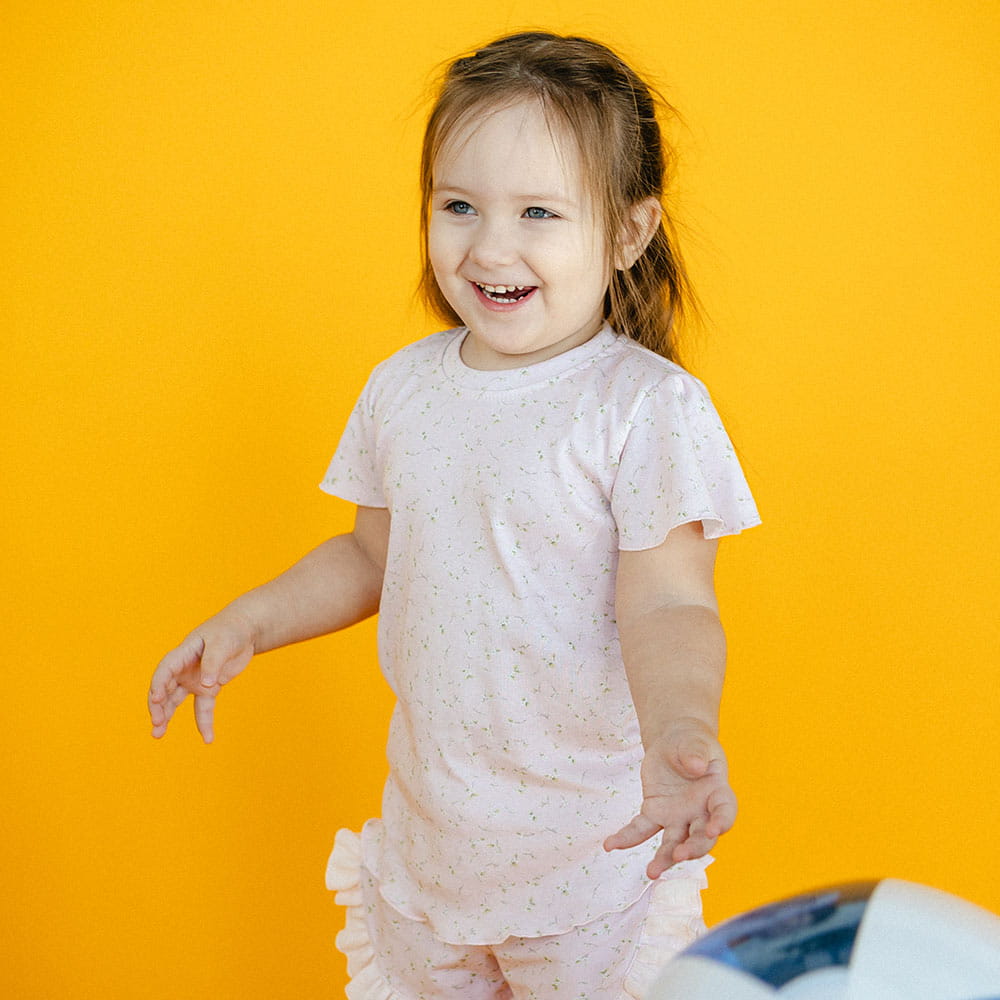 Bluse aus der Meadow-Kollektion, hergestellt aus weichem und angenehm anzufassendem Rippstrick. Die Blusen eignen sich hervorragend für den Sommer oder Frühling, sind luftig und aus Baumwolle gefertigt. Das T-Shirt lässt sich toll mit Leggings oder Shorts kombinieren. Alter des Kindes: Von 6 Monaten bis 4 Jahren Kollektion: Meadow Material: 100 % hochwertige Baumwolle Struktur/Art des Materials: Strickware Pflegehinweise: Maschinenwäsche bei 40 °C, nicht im Wäschetrockner trocknen Muster: Rosa – mit Blümchen Ärmel: Kurzarm Verschluss: Am Schulterträger bis Größe 80 Verarbeitung: Weiche Paspel Herkunft: 100 % polnisches Produkt Zertifikate: „Sicher für Kinder”, „Sicher für Babys” Die Babykleidung von Eevi wird mit Blick auf den Komfort und die Sicherheit der Haut Ihres Kindes hergestellt. Warum vertrauen wir der Marke Eevi seit Jahren so sehr? Die Produkte werden mit Sorgfalt und unter Verwendung von Materialien höchster Qualität genäht. Bei der Herstellung von Babykleidung verwenden wir ausschließlich ökologische Farben, die für die Haut von Kindern und Babys unbedenklich sind. Die Stickereien in unseren Produkten sind von innen gesichert, damit sie die empfindliche Haut des Kindes nicht reizen. Alle Druckknöpfe und Verschlüsse, die wir in unseren Produkten verwenden, sind nickelfrei.