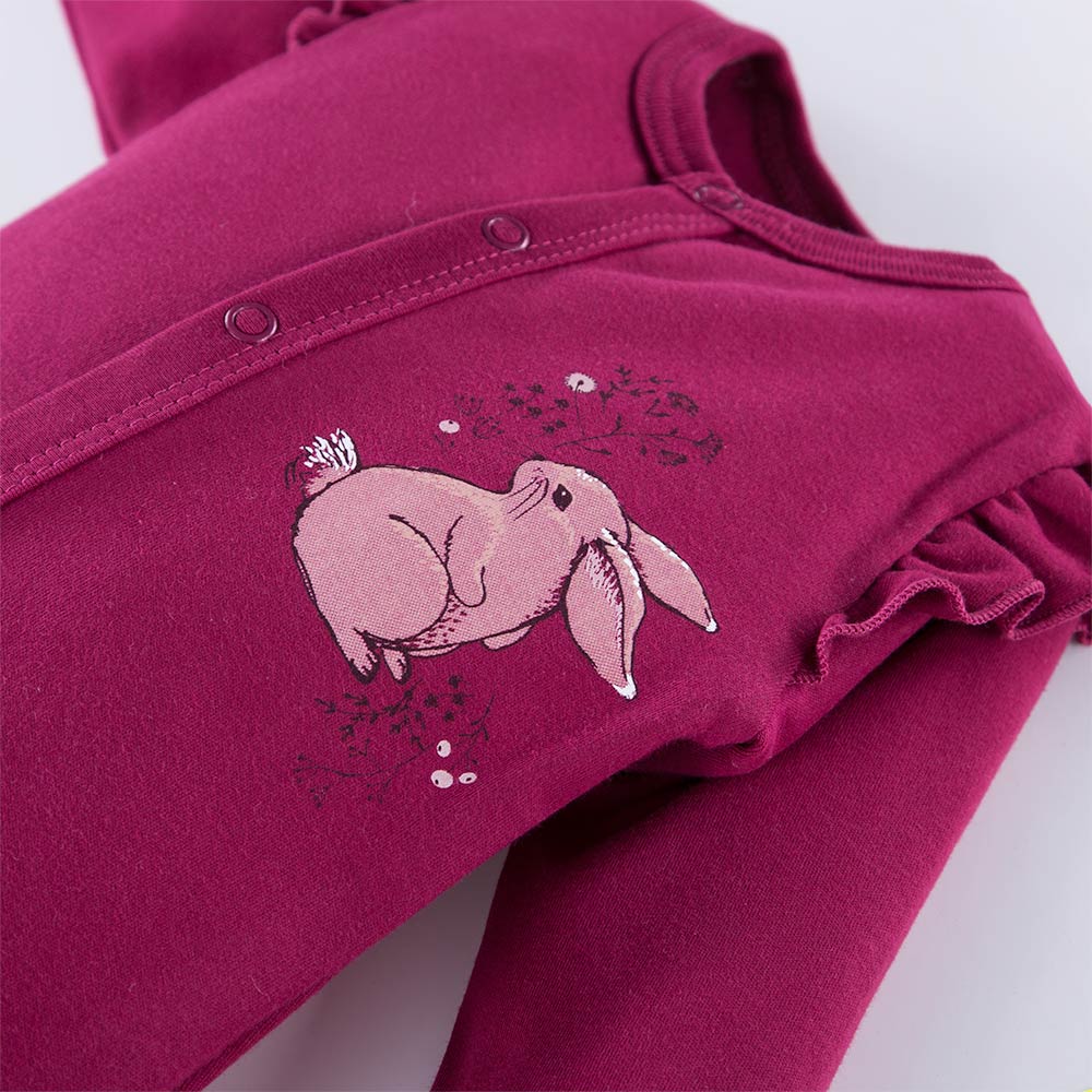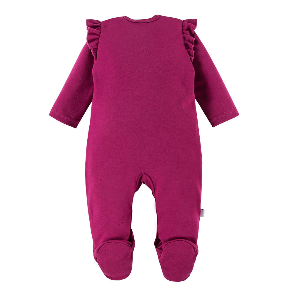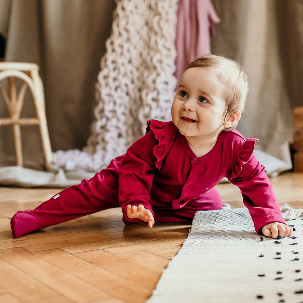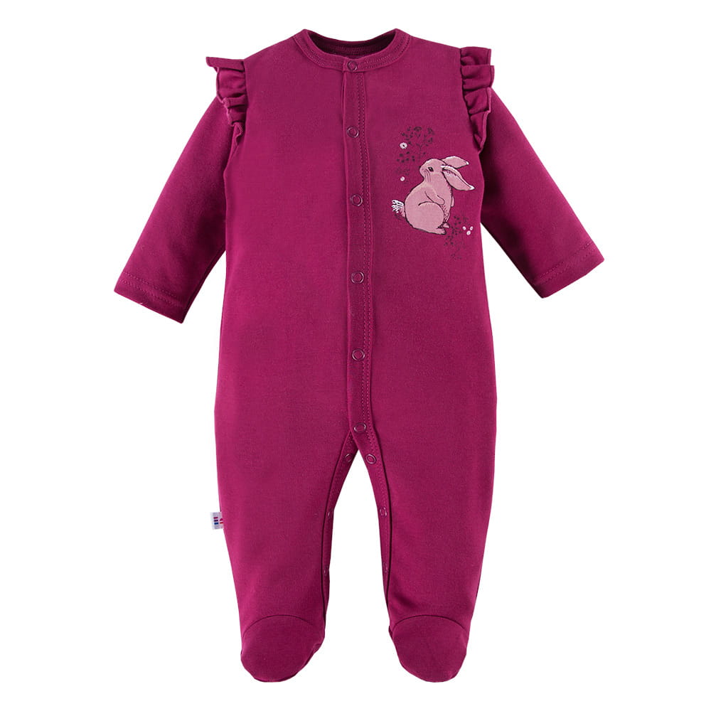 Burgunderroter Baby-Strampler mit Füßchen. Als dekoratives Element dienen ein Bildchen mit einem Hasen und an den Schultern eingenähte Rüschen. Baby-Strampler mit Füßchen sind ein Muss in jeder Babyausstattung. Ideal für Kinder, die sich nachts im Schlaf aufdecken. In unserem Shop sind Strampler bis Größe 104 erhältlich. Mütter wählen meist Strampler für ihre Kleinen. Baby-Strampler sind sowohl für Mütter als auch für Kinder sehr bequem anzuziehen. Alter des Kindes: Von 0 bis 2 Jahren Kollektion: Bloom Material: 100 % hochwertige Baumwolle Struktur/Materialart: Strickware Pflegehinweise: Maschinenwäsche bei 40 °C, nicht im Wäschetrockner trocknen Muster: Einfarbig – Bordeauxrot Ärmel: Langarm Verschluss: Über die gesamte Länge, im Schritt nur bis Größe 86 zu öffnen Verarbeitung: Weiche Paspel Herkunft: 100 % polnisches Produkt Zertifikate: „Sicher für Kinder”, „Sicher für Babys” Die Babykleidung von Eevi wird mit Blick auf den Komfort und die Sicherheit der Haut Ihres Kindes hergestellt. Warum vertrauen wir der Marke Eevi seit Jahren so sehr? Die Produkte werden mit Sorgfalt und unter Verwendung von Materialien höchster Qualität genäht. Bei der Herstellung von Babykleidung verwenden wir ausschließlich ökologische Farben, die für die Haut von Kindern und Babys unbedenklich sind. Die Stickereien in unseren Produkten sind von innen gesichert, damit sie die empfindliche Haut des Kindes nicht reizen. Alle Druckknöpfe und Verschlüsse, die wir in unseren Produkten verwenden, sind nickelfrei.