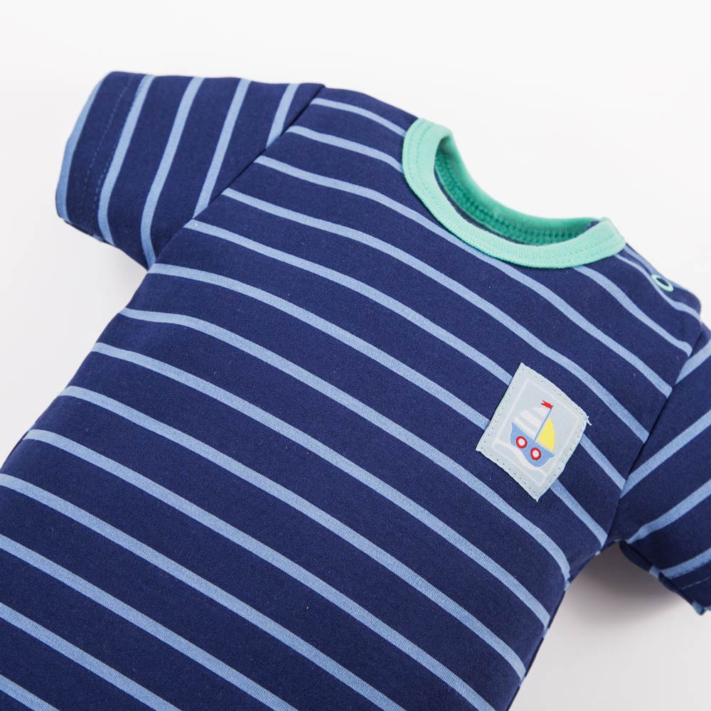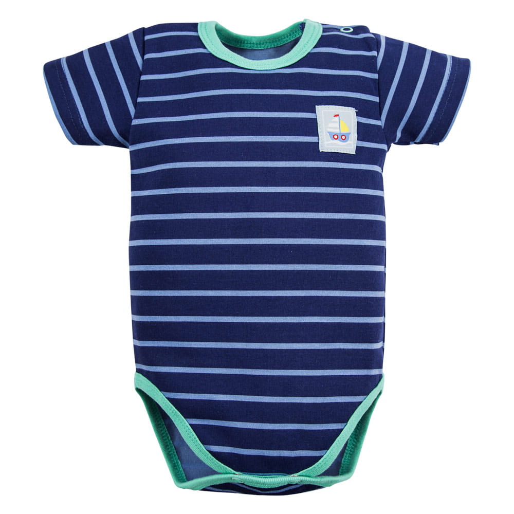 Dunkelblauer Babybody mit Streifen und grüner Paspelierung