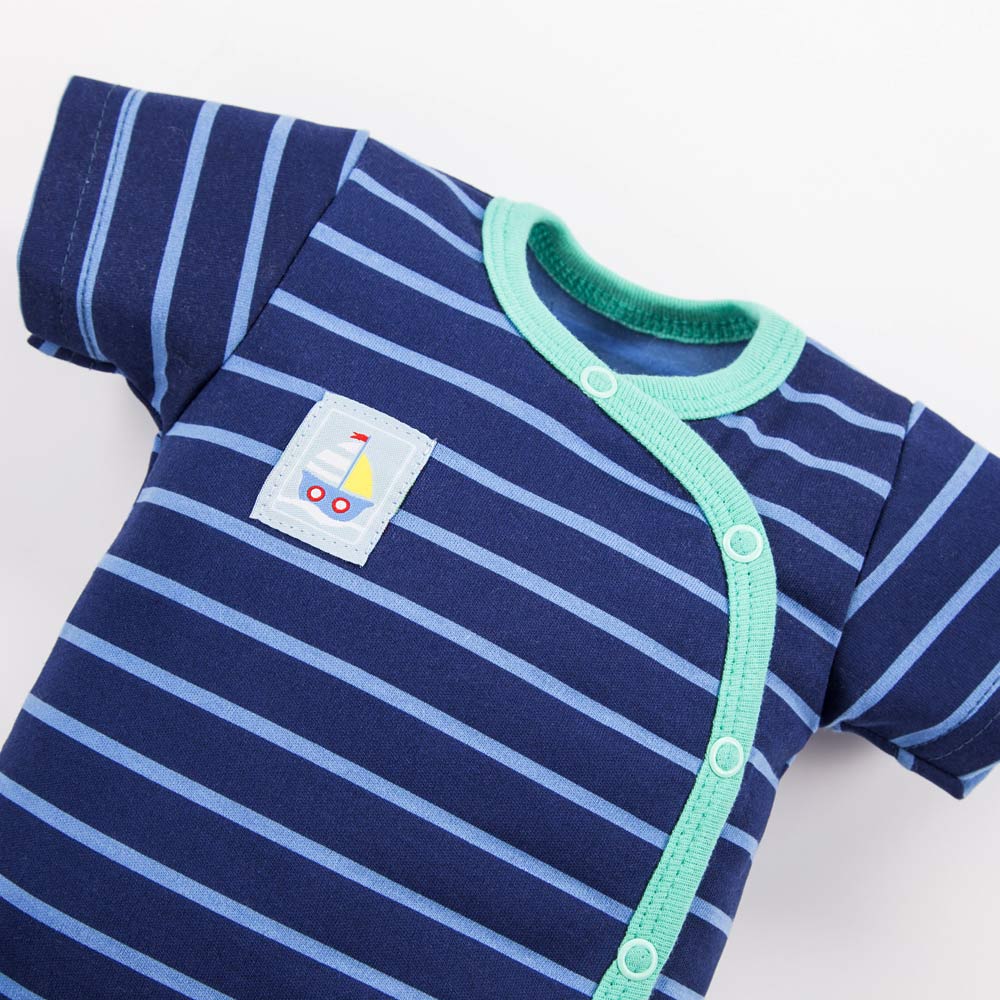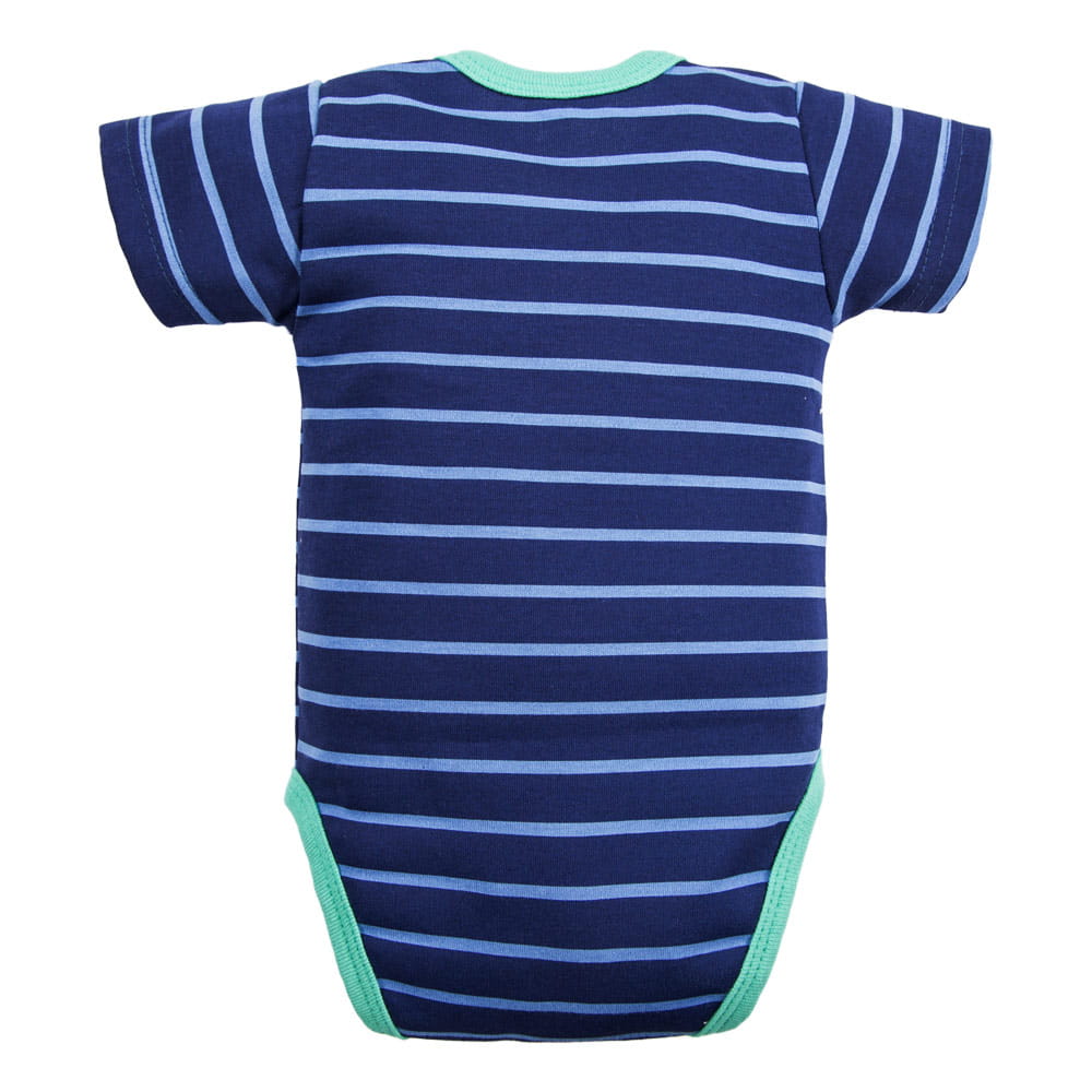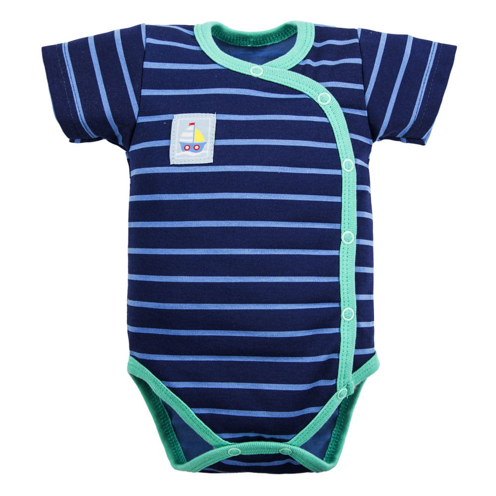 Dunkelblauer Wickelbody mit Streifen und grüner Paspelierung