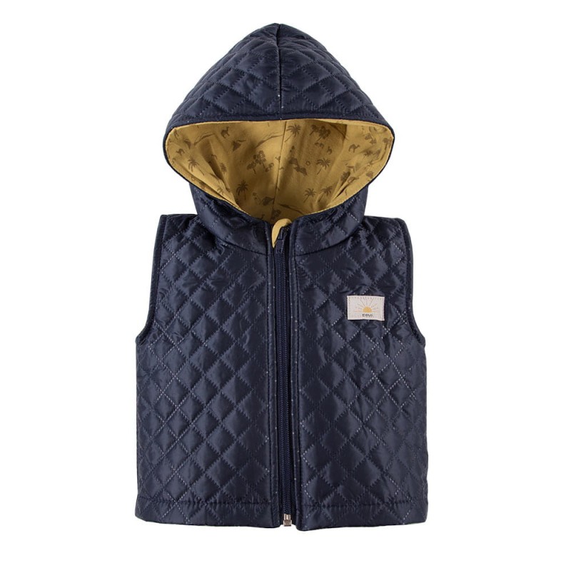 Gesteppte Kinderweste mit Kapuze aus der Sahara-Kollektion, hergestellt aus weichem und angenehmem Jackenstoff. Die Kapuze schützt Ihr Kind an Frühlings- und Sommertagen vor Wind und Kälte. Auf der Vorderseite der Weste befindet sich ein kleines Abzeichen. Die Kinderweste eignet sich ideal für Spaziergänge und zum Spielen auf dem Spielplatz. Alter des Kindes: Von 3 Monaten bis 4 Jahren Kollektion: Sahara Material: 100 % hochwertige Baumwolle Parameter: Oberstoff: 70 g/m^2, Polyesterfüllung: 80 g/m^2, Baumwollfutter: 180 g/m^2 Struktur/Materialart: Strickware/Gewebe Pflegehinweise: Maschinenwäsche bei 40 °C, nicht im Wäschetrockner trocknen Muster: Einfarbig – marineblau, Futter gelb mit Palmen Ärmel: Ärmellos Verschluss: Reißverschluss Verarbeitung: Stickerei Herkunft: POLNISCHES PRODUKT Zertifikate: „Sicher für Kinder”, „Sicher für Babys” Die Babykleidung von Eevi wird mit Blick auf den Komfort und die Sicherheit der Haut Ihres Kindes hergestellt. Warum vertrauen wir der Marke Eevi seit Jahren so sehr? Die Produkte werden mit Sorgfalt und unter Verwendung von Materialien höchster Qualität genäht. Bei der Herstellung von Babykleidung verwenden wir ausschließlich ökologische Farben, die für die Haut von Kindern und Babys unbedenklich sind. Die Stickereien in unseren Produkten sind von innen gesichert, damit sie die empfindliche Haut des Kindes nicht reizen. Alle Druckknöpfe und Verschlüsse, die wir in unseren Produkten verwenden, sind nickelfrei.