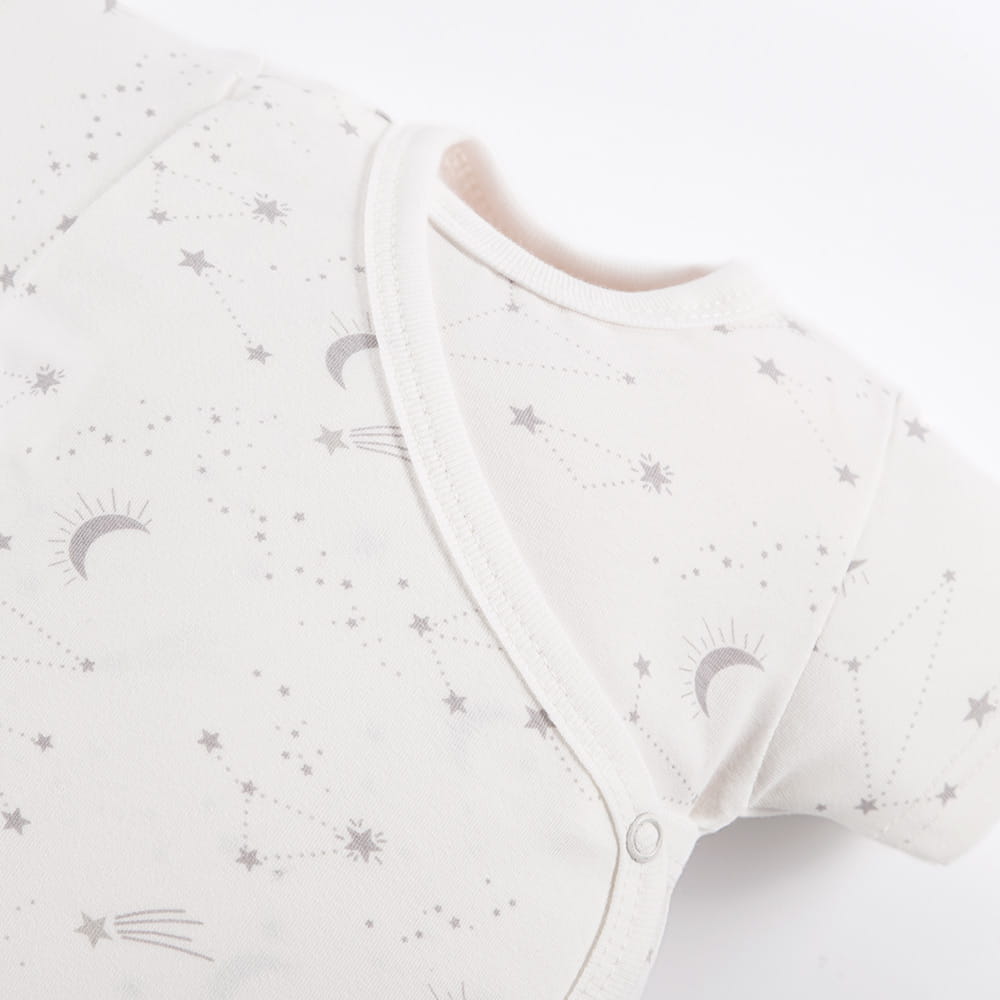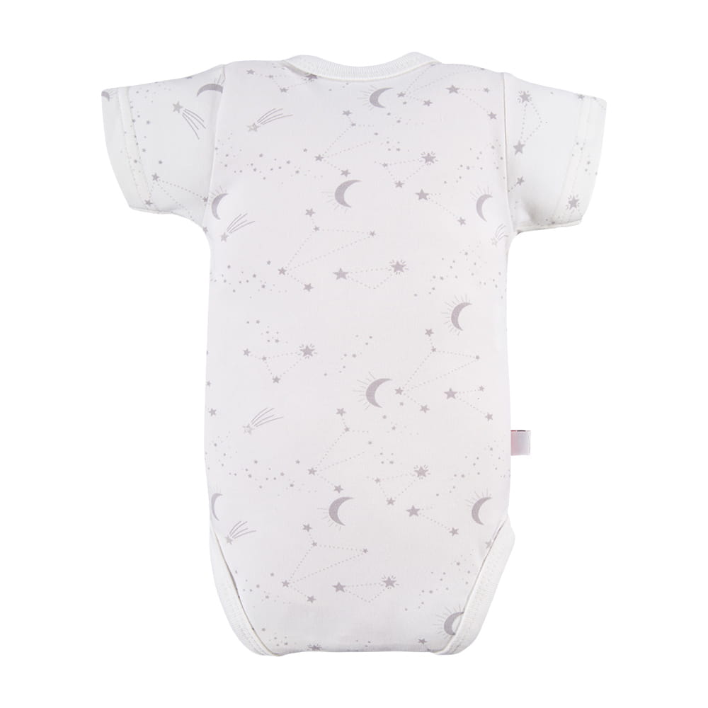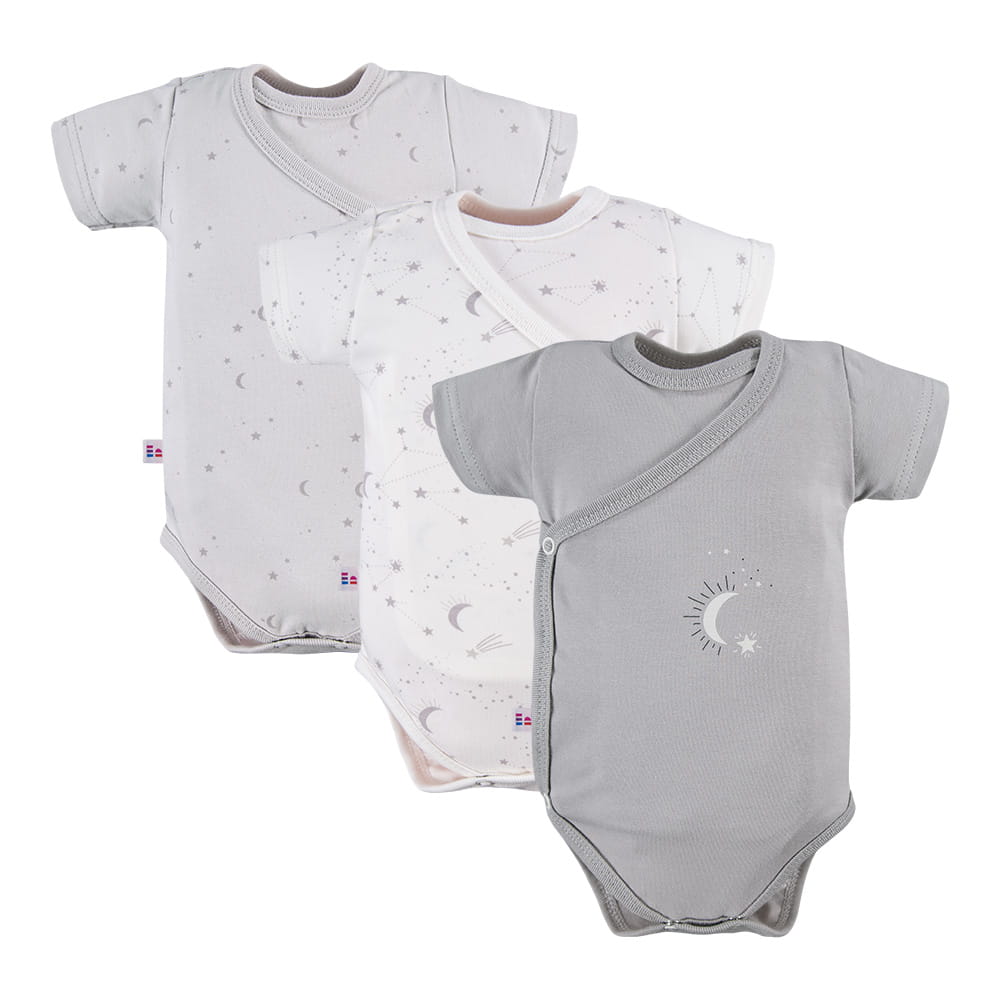Set aus 3 Wickelbodys in Ecru- und Grautönen mit süßem Sternmotiv ist die perfekte Wahl für die ersten Lebensmonate eines Babys. Wickelbodys gehören zu den am häufigsten gewählten Kleidungsstücken für Neugeborene – praktisch, bequem und sehr funktional.