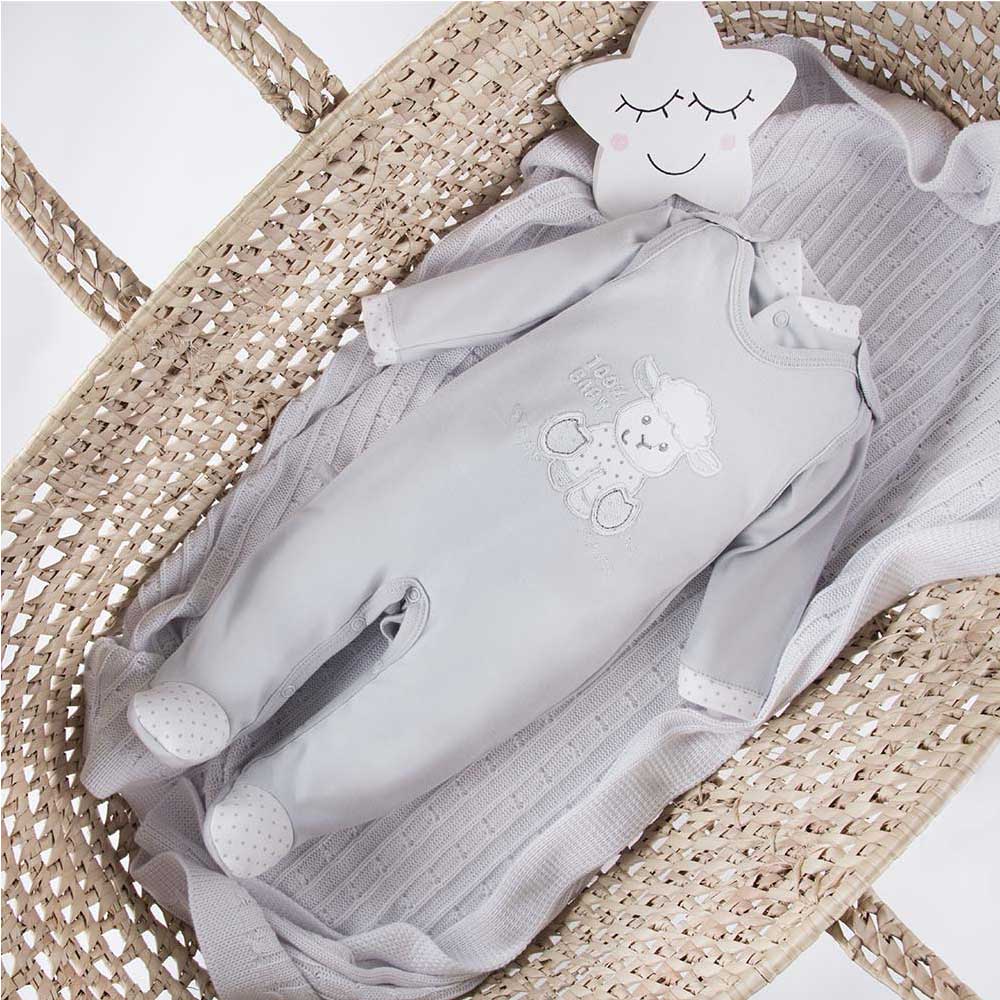 Grauer Babystrampler mit Schaf – Newborn Kollektion