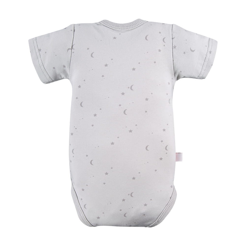 Grauer Wickelbody für Babys mit kurzen Ärmeln und Sternenmuster ist eine bequeme und praktische Wahl für Säuglinge in den ersten Monaten. Das dezente Sternenmuster verleiht dem Body einen freundlichen, kindlichen Charme.