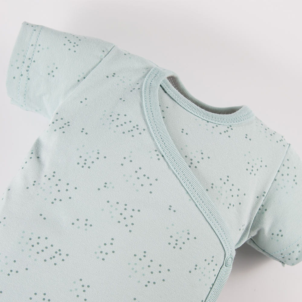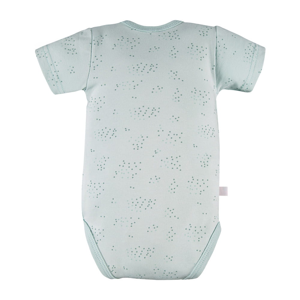 Grüner Wickelbody für Babys mit kurzen Ärmeln ist eine bequeme und praktische Wahl für Säuglinge in den ersten Monaten. Das dezente Muster verleiht dem Body einen sanften, kindlichen Charme.