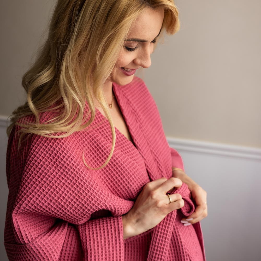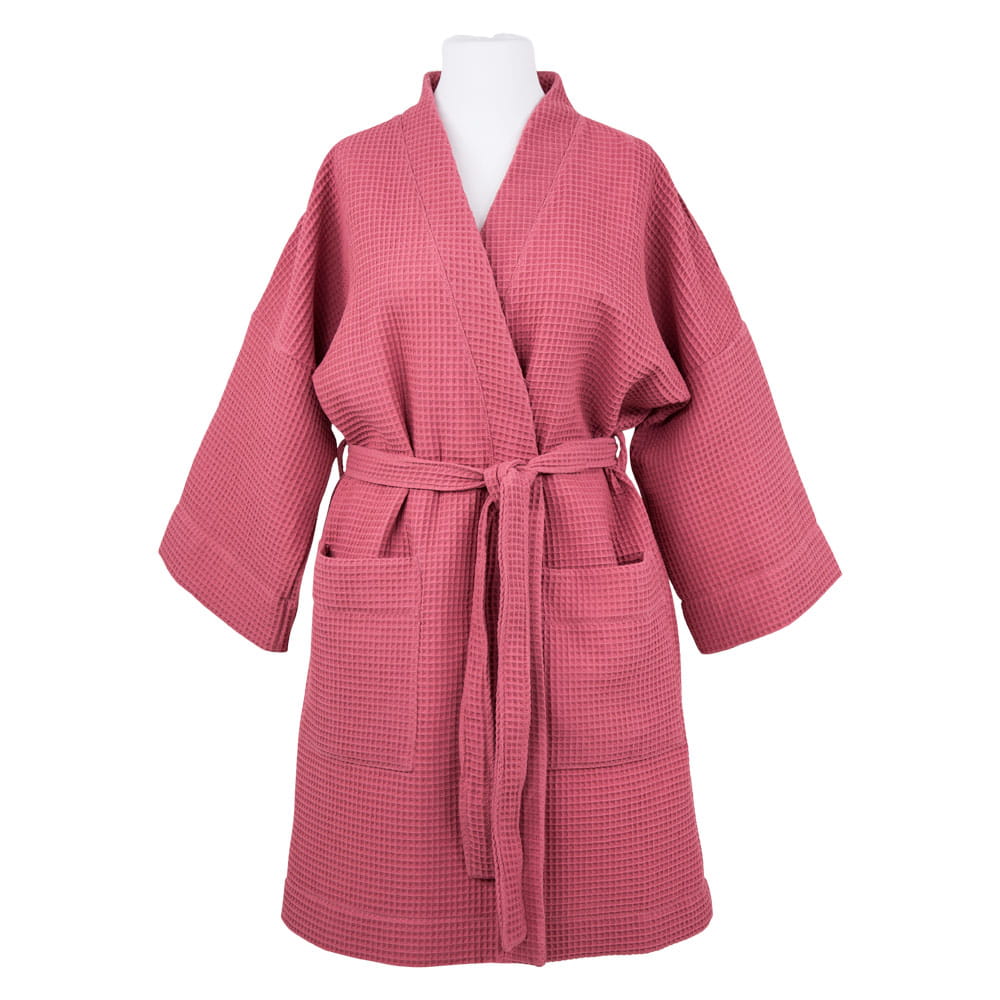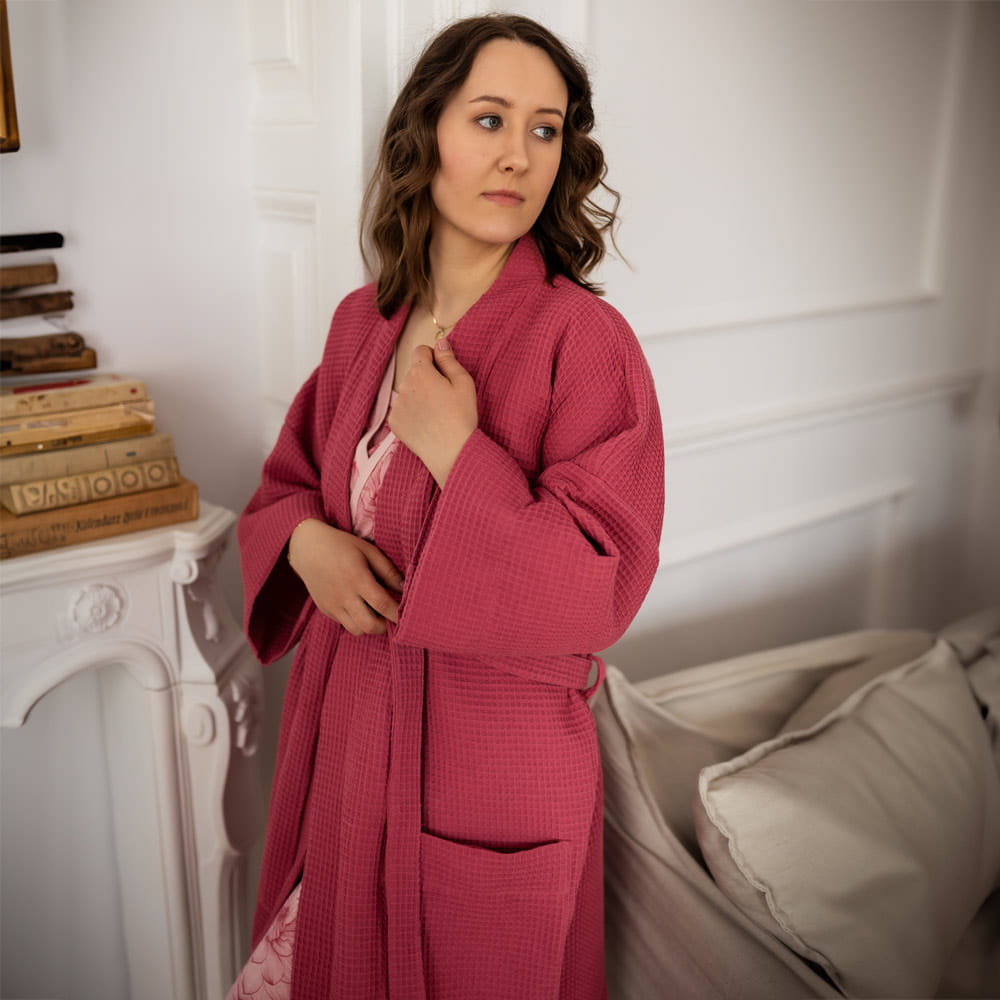 Kimono-Bademantel für Damen aus Waffelstoff in Himbeerrot