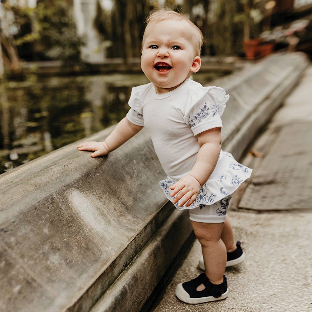 Kinder-Bloomer mit Rüschen, weiß mit blauen Blumen