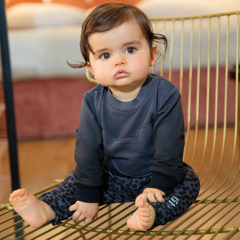 Kinder-Sweatshirt Ombre mit Teddybär Das Kinder-Sweatshirt ist ideal für Spaziergänge und zum Spielen auf dem Spielplatz. Das niedliche Sweatshirt mit gesticktem Teddybär bildet zusammen mit den Shorts aus derselben Kollektion ein hübsches Set. Alter des Kindes: Von 3 Monaten bis 3 Jahren Kollektion: Magic Material: 100 % hochwertige Baumwolle Struktur/Art des Materials: Strickware Pflegehinweise: Maschinenwäsche bei 40 °C, nicht im Wäschetrockner trocknen Muster: Ombre-Farbe – grau und schwarz Ärmel: Langarm Verschluss: Über den Kopf, Druckknöpfe nur bis Größe 80 Verarbeitung: Weicher Bündchen Herkunft: POLNISCHES PRODUKT Zertifikate: „Sicher für Kinder”, „Sicher für Babys” Die Babykleidung von Eevi wird mit Blick auf den Komfort und die Sicherheit der Haut Ihres Kindes hergestellt. Warum vertrauen wir der Marke Eevi seit Jahren so sehr? Die Produkte werden mit Sorgfalt und unter Verwendung von Materialien höchster Qualität genäht. Bei der Herstellung von Babykleidung verwenden wir ausschließlich ökologische Farben, die für die Haut von Kindern und Babys unbedenklich sind. Die Stickereien in unseren Produkten sind von innen gesichert, damit sie die empfindliche Haut des Kindes nicht reizen. Alle Druckknöpfe und Verschlüsse, die wir in unseren Produkten verwenden, sind nickelfrei.