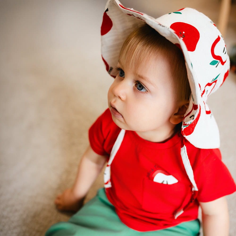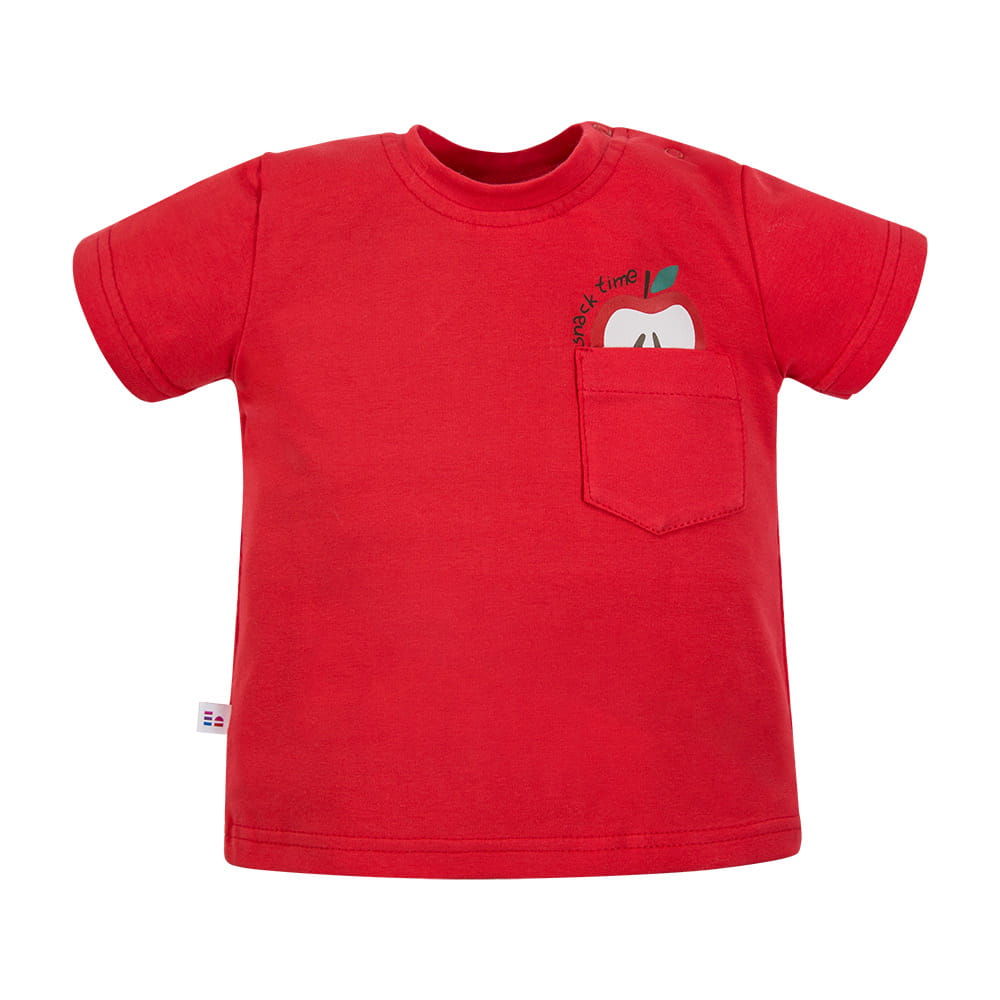 Rotes Kinder T-Shirt aus der Kollektion Snack Time ist eine bequeme und stilvolle Wahl für den Alltag. Das Shirt in intensivem Rot verfügt über eine kleine Seitentasche, aus der ein Apfelmotiv herausragt und dem Kleidungsstück einen verspielten Charakter verleiht.