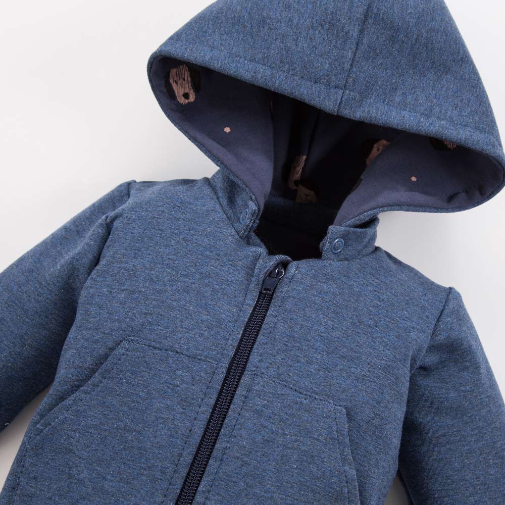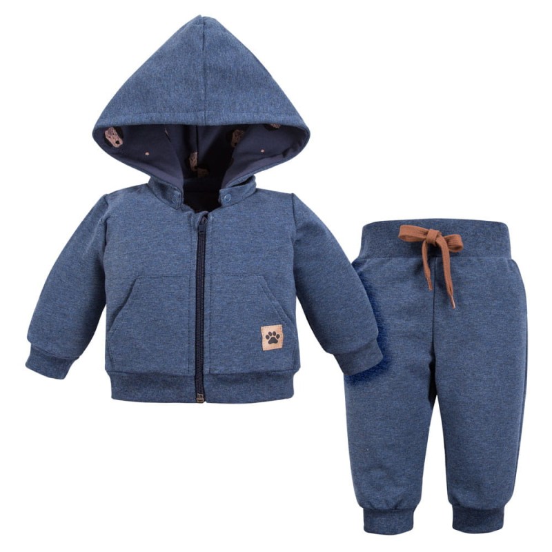 Jungen-Trainingsanzug aus der Kollektion Puppy Playtime, gefertigt aus weichem und angenehmem Sweatshirtstoff. Das Sweatshirt ist mit einem weichen Bündchen versehen. Das Sweatshirt wird mit einem Reißverschluss geschlossen. Die Hose hat einen Gummizug in der Taille. Als dekoratives Element dient ein aufgenähter Aufnäher auf dem Sweatshirt. Der Kinder-Trainingsanzug eignet sich ideal für Spaziergänge und zum Spielen auf dem Spielplatz. Er ist auch ein perfektes Geschenk für einen kleinen Jungen. Trainingsanzüge sind sehr praktisch, man muss nicht das gesamte Outfit planen, sondern nur ein passendes T-Shirt oder einen Body dazu aussuchen. Alter des Kindes: Von 3 Monaten bis 4 Jahren Kollektion: Puppy Playtime Material: 100 % hochwertige Baumwolle Struktur/Art des Materials: Strickware Pflegehinweise: Maschinenwäsche bei 40 °C, nicht im Wäschetrockner trocknen Muster: Farbe: Marineblau Ärmel: Lang Verschluss: Reißverschluss Verarbeitungsart: Rippbündchen Herkunft: 100 % polnisches Produkt Zertifikate: „Sicher für Kinder”, „Sicher für Babys” Die Babykleidung von Eevi wird mit Blick auf den Komfort und die Sicherheit der Haut Ihres Kindes hergestellt. Warum vertrauen wir der Marke Eevi seit Jahren so sehr? Die Produkte werden mit Sorgfalt und unter Verwendung von Materialien höchster Qualität genäht. Bei der Herstellung von Babykleidung verwenden wir ausschließlich ökologische Farben, die für die Haut von Kindern und Babys unbedenklich sind. Die Stickereien in unseren Produkten sind von innen gesichert, damit sie die empfindliche Haut des Kindes nicht reizen. Alle Druckknöpfe und Verschlüsse, die wir in unseren Produkten verwenden, sind nickelfrei.