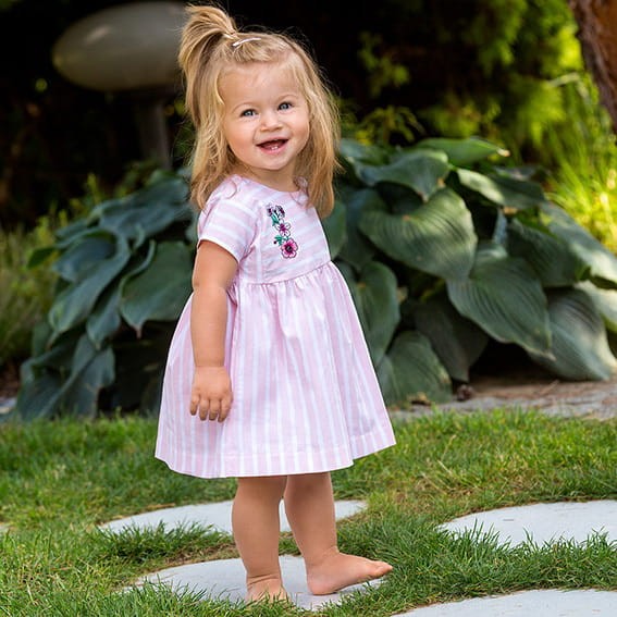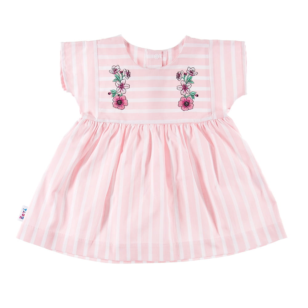 Kleid aus der Kollektion „Flower” aus weichem, angenehm zu tragendem Stoff mit Streifenmuster. Auf der Vorderseite befinden sich kleine Stickereien, die von innen gesichert sind, damit sie die empfindliche Haut des Kindes nicht reizen. Auf der Rückseite befindet sich eine Öffnung mit nickelfreien Druckknöpfen. Hergestellt in Polen. 97 % Baumwolle, 3 % Spantex