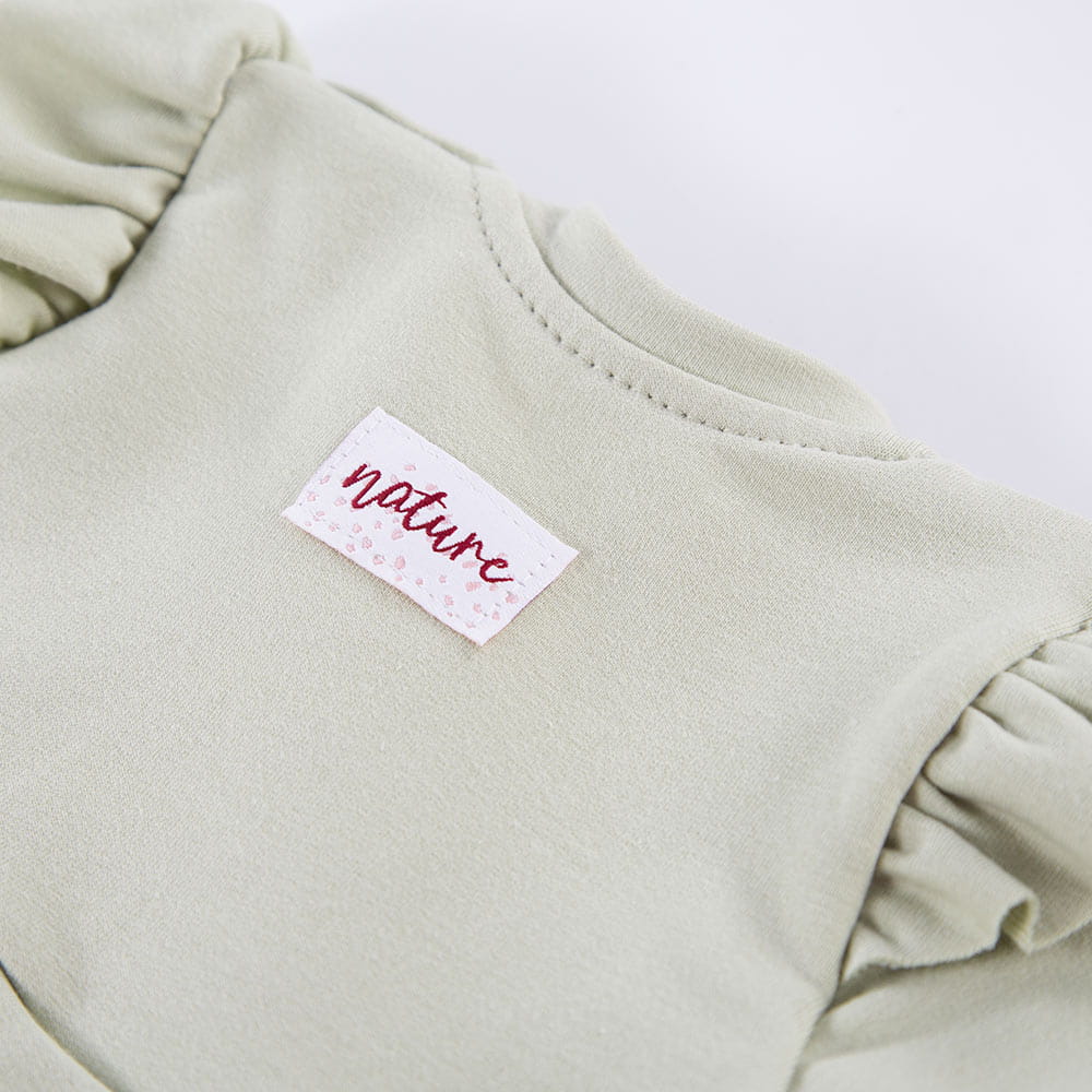 Der Verschluss an der Schulter erleichtert das An- und Ausziehen des Kindes. Ein dekorativer Aufnäher im Nackenbereich ist ein zusätzliches Detail. Der ausgestellte Schnitt sorgt für Komfort und Bewegungsfreiheit im Alltag.