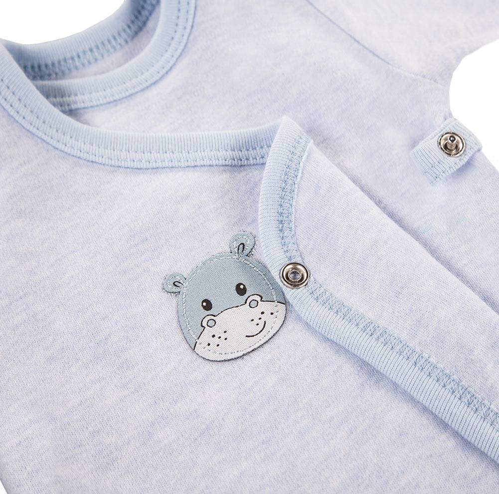 Blauer Wickelbody mit kurzen Ärmeln aus der Kollektion „Baby Love“, genäht aus weichem und angenehm anzufassendem meliertem Baumwollstrick. Auf der Vorderseite des Wickelbody befindet sich ein niedlicher Aufnäher mit einem Tiermotiv. Der Schnitt ermöglicht ein vollständiges Aufknöpfen, wodurch der Body funktional und bequem ist. Der Body ist mit einem weichen Saum versehen. Babybodys eignen sich ideal für die ersten Lebensmonate des Kindes und gehören zu den von Müttern am häufigsten gewählten Artikeln. Die Babykleidung von Eevi wird mit Sorgfalt für den Komfort und die Sicherheit der Haut Ihres Kindes hergestellt. Warum vertrauen Mütter seit Jahren der Marke Eevi? Die Produkte werden mit Sorgfalt und unter Verwendung von Materialien höchster Qualität genäht. Bei der Herstellung von Babykleidung verwenden wir ausschließlich ökologische Farben, die für die Haut von Kindern und Babys unbedenklich sind. Die Stickereien in unseren Produkten sind von innen gesichert, damit sie die empfindliche Haut des Kindes nicht reizen. Alle Druckknöpfe und Verschlüsse, die wir in unseren Produkten verwenden, sind nickelfrei. Die von uns angebotenen Bodys sind zertifiziert: „Sicher für Kinder” „Sicher für Babys” Material: 100 % hochwertige Baumwolle Alter des Kindes: 0 bis 6 Monate PRODUKT 100 % POLNISCH