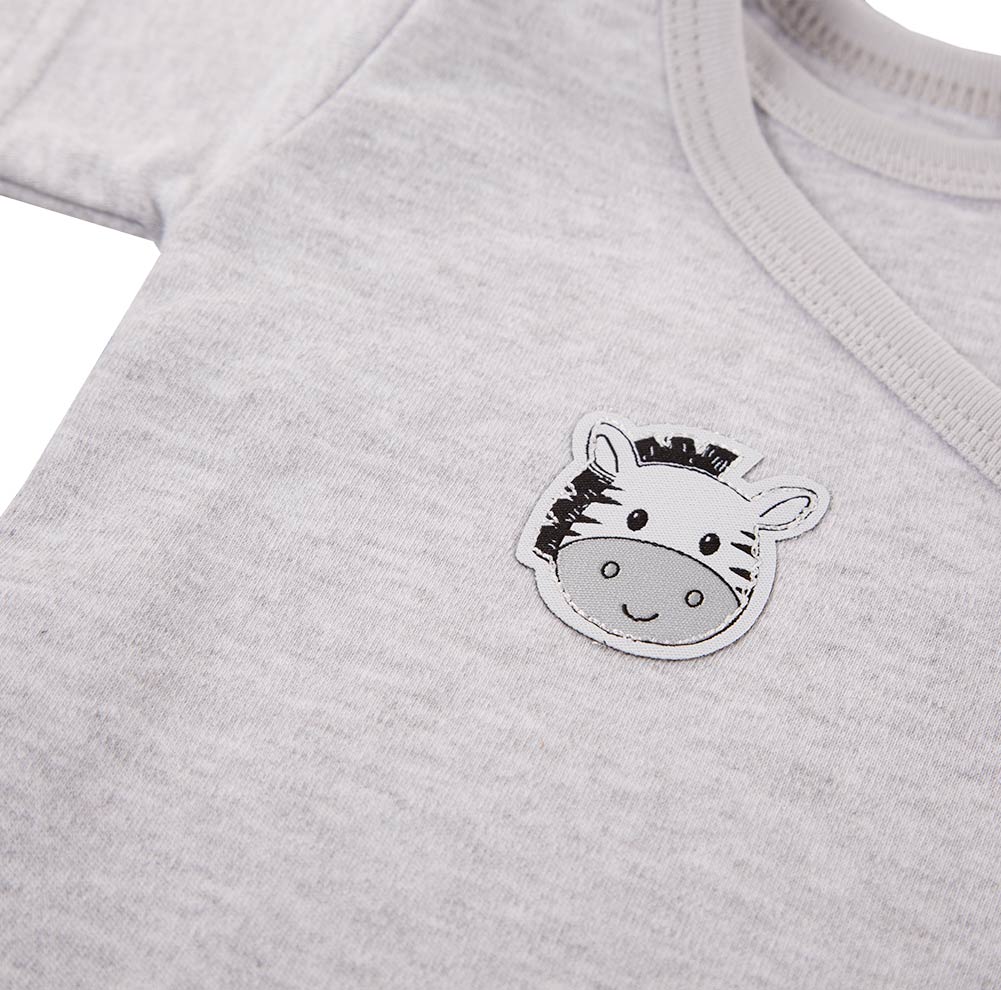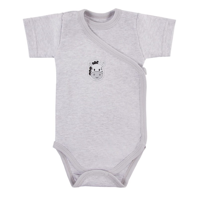 Grauer Wickelbody mit kurzen Ärmeln aus der Kollektion „Baby Love“, genäht aus weichem und angenehm anzufassendem meliertem Baumwollstrick. Auf der Vorderseite des Wickelbody befindet sich ein niedlicher Aufnäher mit einem Tiermotiv. Der Schnitt ermöglicht ein vollständiges Aufknöpfen, wodurch der Body funktional und bequem ist. Der Body ist mit einem weichen Saum versehen. Babybodys eignen sich ideal für die ersten Lebensmonate des Kindes und gehören zu den von Müttern am häufigsten gewählten Artikeln. Die Babykleidung von Eevi wird mit Sorgfalt für den Komfort und die Sicherheit der Haut Ihres Kindes hergestellt. Warum vertrauen Mütter seit Jahren der Marke Eevi? Die Produkte werden mit Sorgfalt und unter Verwendung von Materialien höchster Qualität genäht. Bei der Herstellung von Babykleidung verwenden wir ausschließlich ökologische Farben, die für die Haut von Kindern und Babys unbedenklich sind. Die Stickereien in unseren Produkten sind von innen gesichert, damit sie die empfindliche Haut des Kindes nicht reizen. Alle Druckknöpfe und Verschlüsse, die wir in unseren Produkten verwenden, sind nickelfrei. Die von uns angebotenen Bodys sind zertifiziert: „Sicher für Kinder” „Sicher für Babys” Material: 100 % hochwertige Baumwolle Alter des Kindes: 0 bis 6 Monate PRODUKT 100 % POLNISCH