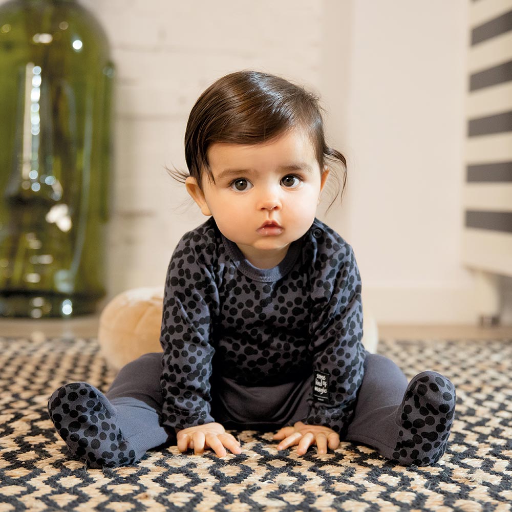 Grafite Kinder-Halbstrampler. Halbstrampler eignen sich hervorragend für jede Jahreszeit. Sie sind eine sehr gute Wahl für Babys, die im Winter oder Sommer geboren werden. Unbedeckte Füße sind ein Problem für alle Eltern. Söckchen rutschen herunter, und wir Eltern möchten, dass unser Baby warm hat und seine Füße nicht frieren. Von 0 bis 12 Monaten Kollektion: Magic Material: 100 % hochwertige Baumwolle Struktur/Materialart: Strickware Pflegehinweise: Maschinenwäsche bei 40 °C, nicht im Wäschetrockner trocknen Muster: Graphitfarben Verschluss: keiner Verarbeitung: Weicher Saum Herkunft: 100 % polnisches Produkt Zertifikate: „Sicher für Kinder”, „Sicher für Babys” Die Babykleidung von Eevi wird mit Blick auf den Komfort und die Sicherheit der Haut Ihres Kindes hergestellt. Warum vertrauen wir der Marke Eevi seit Jahren so sehr? Die Produkte werden mit Sorgfalt und unter Verwendung von Materialien höchster Qualität genäht. Bei der Herstellung von Babykleidung verwenden wir ausschließlich ökologische Farben, die für die Haut von Kindern und Babys unbedenklich sind. Die Stickereien in unseren Produkten sind von innen gesichert, damit sie die empfindliche Haut des Kindes nicht reizen. Alle Druckknöpfe und Verschlüsse, die wir in unseren Produkten verwenden, sind nickelfrei.