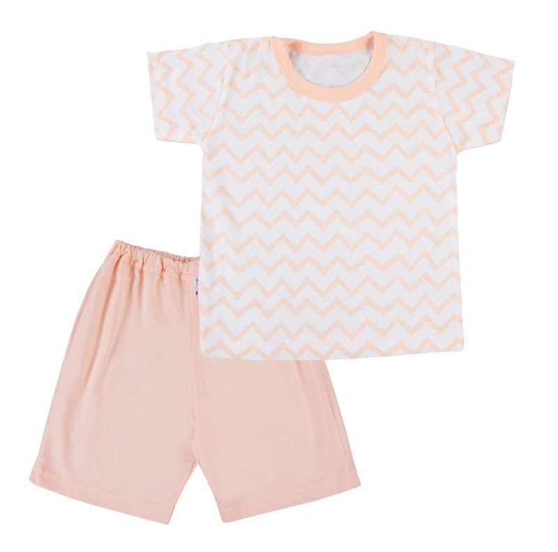 Sommerpyjama mit Zickzackmuster aus der Kollektion „Zygzak“, genäht aus weichem und angenehmem Stoff in mehreren Farbvarianten, unterbrochen von Drucken, die mit ökologischen Farben hergestellt wurden. Die Bluse ist am Halsausschnitt mit weichen Borten versehen. Die Shorts haben einen Gummizug in der Taille, der den Bauch des Kindes nicht einengt. Hergestellt in Polen, mit dem Zertifikat „Sicher für Kinder”. 100 % Baumwolle