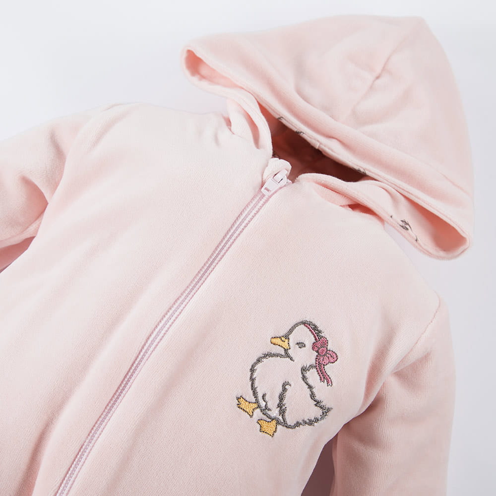 Rosa Overall mit Kapuze. Der Overall ist aus weichem und angenehmem Velours gefertigt und innen mit Baumwollfutter versehen. Babyoveralls mit Kapuze eignen sich hervorragend für den Krankenhausaufenthalt und sind ein Muss in jeder Babyausstattung. Alter des Kindes: 0 bis 6 Monate Kollektion: Little ducks Material: Futter: 100 % hochwertige Baumwolle, Obermaterial: 80 % hochwertige Baumwolle, 20 % Polyester Struktur/Materialart: Strickware Pflegehinweise: Maschinenwäsche bei 40 °C, nicht im Wäschetrockner trocknen Muster: Farbe Rosa – mit Entenprint Ärmel: Langarm Verschluss: Durchgehender Reißverschluss Verarbeitung: Weicher Bündchen Herkunft: 100 % polnisches Produkt Zertifikate: „Sicher für Kinder”, „Sicher für Babys” Die Babykleidung von Eevi wird mit Sorgfalt für den Komfort und die Sicherheit der Haut Ihres Kindes hergestellt. Warum vertrauen wir der Marke Eevi seit Jahren so sehr? Die Produkte werden mit Sorgfalt und unter Verwendung von Materialien höchster Qualität genäht. Bei der Herstellung von Babykleidung verwenden wir ausschließlich ökologische Farben, die für die Haut von Kindern und Babys unbedenklich sind. Die Stickereien in unseren Produkten sind von innen gesichert, damit sie die empfindliche Haut des Kindes nicht reizen. Alle Druckknöpfe und Verschlüsse, die wir in unseren Produkten verwenden, sind nickelfrei.