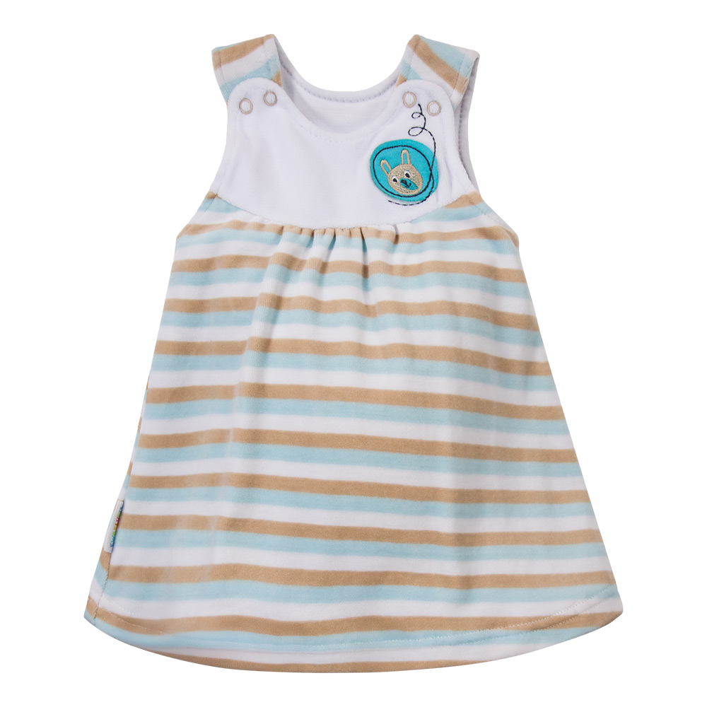 Die Tunika besteht aus angenehm weichem Velours in beige-türkisen Streifen. Niedliche Tierstickereien verleihen ihr einen besonderen Charme. Das Modell wird mit nickelfreien Druckknöpfen geschlossen und kann vollständig geöffnet werden, was das Anziehen erleichtert.