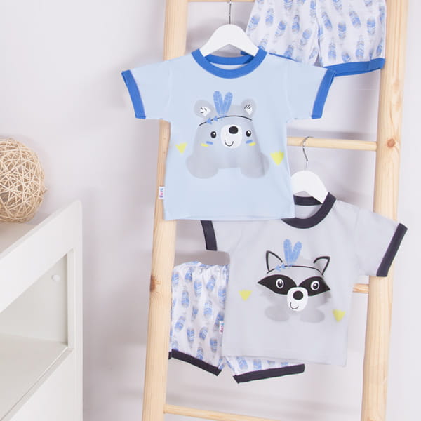 Sommerpyjama für Jungen aus der Kollektion „Family”, genäht aus weichem und angenehmem Stoff in drei Farbvarianten mit Aufdrucken, die mit ökologischen Farben hergestellt wurden. Die Bluse ist am Halsausschnitt und an den Ärmeln mit weichen Paspeln versehen. Die Shorts haben einen Gummizug in der Taille, der den Bauch des Kindes nicht einengt. Die Hosenbeine sind ebenfalls mit einem Bündchen versehen. Die bunten Aufdrucke auf der Vorderseite des Schlafanzugs sind mit kindersicheren Farben hergestellt. Hergestellt in Polen, mit dem Zertifikat „Sicher für Kinder”. 100 % Baumwolle