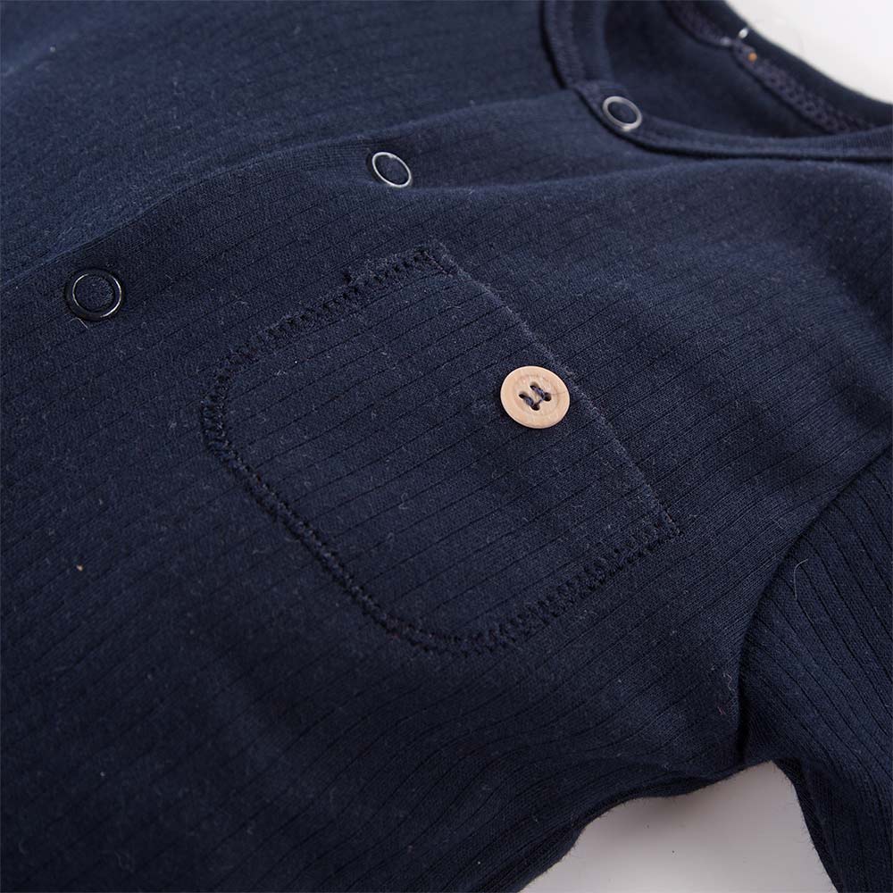 Baby-Strampler mit Tasche ohne Füße aus der Kollektion „SIMPLY COMFY”, genäht aus weichem und angenehm anzufassendem Baumwollstrick mit Rippmuster. Auf der Vorderseite des Stramplers befindet sich eine Tasche mit Knopf. Die Hosenbeine sind mit einem breiten Bündchen abgeschlossen. Der Schnitt ermöglicht ein vollständiges Aufknöpfen, wodurch das Kleidungsstück funktional und bequem ist. Der Strampler ist mit einer Paspelierung versehen. Baby-Strampler eignen sich ideal für die ersten Lebensmonate des Kindes. Sie können als Schlafanzug oder Ausgehkleidung verwendet werden. Die Babykleidung von Eevi wird mit Sorgfalt für den Komfort und die Sicherheit der Haut Ihres Kindes hergestellt. Warum vertrauen wir der Marke Eevi seit Jahren so sehr? Die Produkte werden mit Präzision und unter Verwendung von Materialien höchster Qualität genäht. Bei der Herstellung von Babykleidung verwenden wir ausschließlich ökologische Farben, die für die Haut von Kindern und Babys unbedenklich sind. Die Stickereien in unseren Produkten sind von innen gesichert, damit sie die empfindliche Haut des Kindes nicht reizen. Alle Druckknöpfe und Verschlüsse, die wir in unseren Produkten verwenden, sind nickelfrei. Der von uns angebotene Strampler ohne Füße ist zertifiziert: „Sicher für Kinder” „Sicher für Babys” Material: 100 % hochwertige Baumwolle Alter des Kindes: von 6 Monaten bis 4 Jahren Produkt 100 % POLNISCH