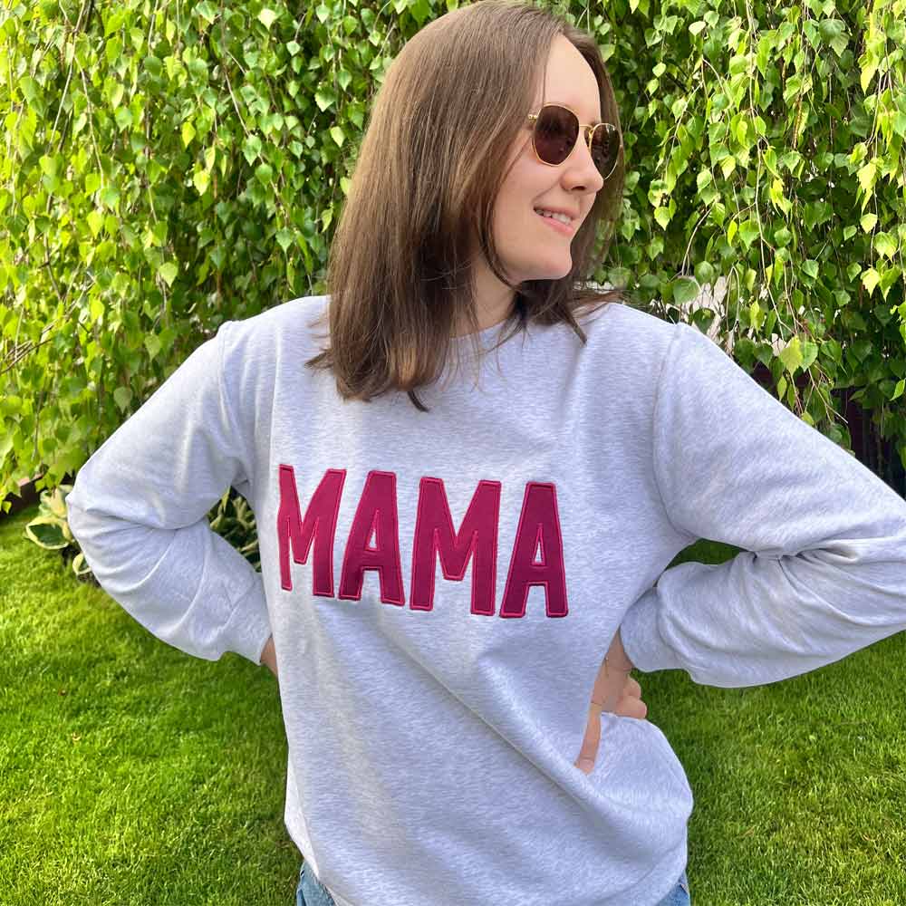 Sweatshirt mit der Aufschrift MAMA, grau mit burgunderroter Stickerei