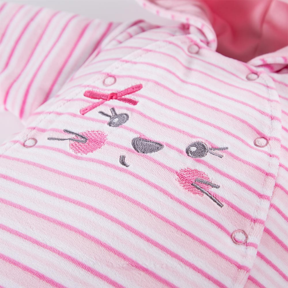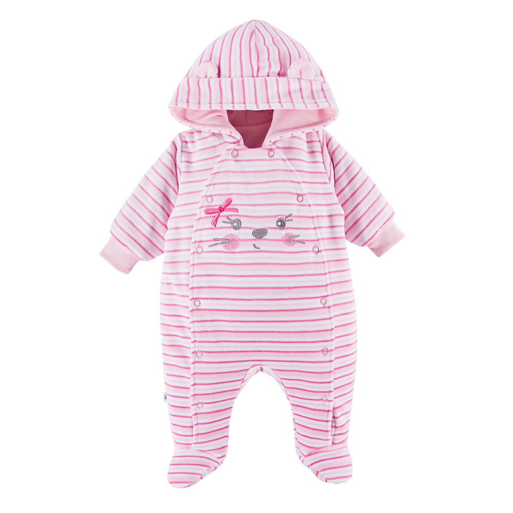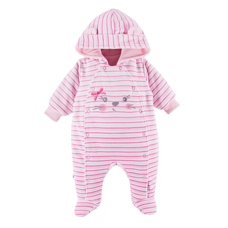 Ecrufarbener Overall für Kinder aus warmem Velours. Der Overall hat eine Kapuze und niedliche Ohren. Das Futter des Overalls besteht zu 100 % aus Baumwolle. Der Strampler mit Kapuze ist ideal für den Krankenhausaufenthalt in den kühlen Monaten. Er ist ein Muss in der Babyausstattung für Kinder, die im Winter und Herbst geboren werden. Alter des Kindes: 0 bis 9 Monate Kollektion: RUN&FUN Material: Obermaterial: 80 % Baumwolle, 20 % Polyester, Futter: 100 % hochwertige Baumwolle, Füllung: 100 % Polyester Struktur/Materialart: Strickware Pflegehinweise: Maschinenwäsche bei 40 °C, nicht im Wäschetrockner trocknen Muster: Gestreift – rosa, weiß Verschluss: Druckknöpfe Verzierung: Tierstickerei Herkunft: 100 % polnisches Produkt Zertifikate: „Sicher für Kinder”, „Sicher für Babys” Die Babykleidung von Eevi wird mit Blick auf den Komfort und die Sicherheit der Haut Ihres Kindes hergestellt. Warum vertrauen wir der Marke Eevi seit Jahren so sehr? Die Produkte werden mit Sorgfalt und unter Verwendung von Materialien höchster Qualität genäht. Bei der Herstellung von Babykleidung verwenden wir ausschließlich ökologische Farben, die für die Haut von Kindern und Babys unbedenklich sind. Die Stickereien in unseren Produkten sind von innen gesichert, damit sie die empfindliche Haut des Kindes nicht reizen. Alle Druckknöpfe und Verschlüsse, die wir in unseren Produkten verwenden, sind nickelfrei.