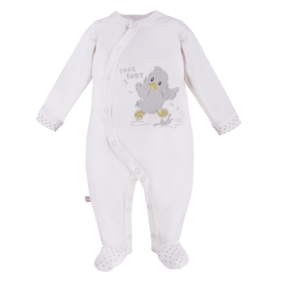 Auf der Vorderseite befindet sich eine niedliche Enten-Stickerei, die von innen gesichert ist, um die empfindliche Haut des Babys nicht zu reizen. Der Strampler hat einen praktischen Schnitt mit durchgehenden Druckknöpfen, die das An- und Ausziehen sowie das Windelwechseln erleichtern. Die Ärmel sind mit Manschetten und dezenten Drucken versehen, weiche Einfassungen sorgen für zusätzlichen Komfort.