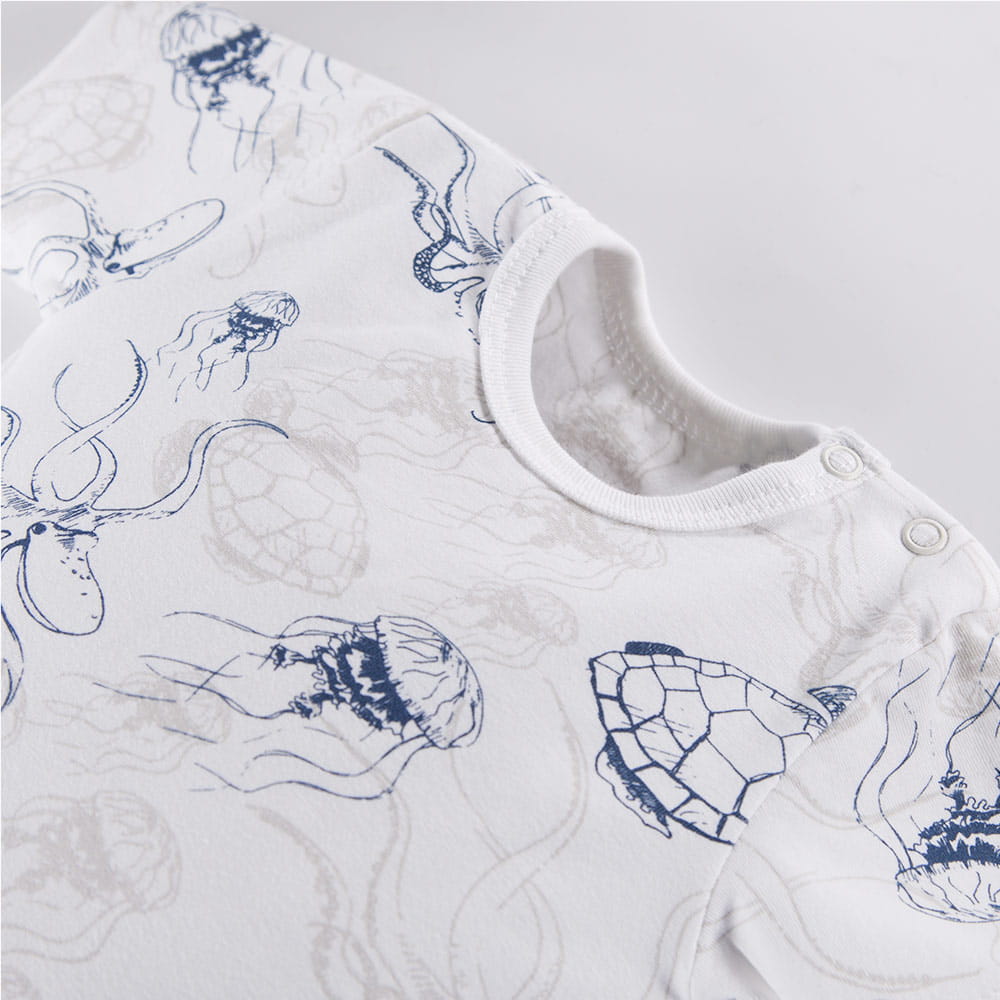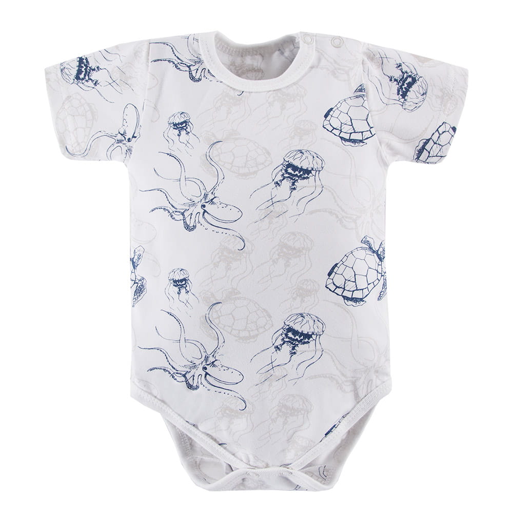 Kurzärmeliger Baby-Body mit Meeresbewohnern. Der Baby-Body ist ideal für Kinder bis zu 3 Jahren. Mütter wählen meist Bodys für ihre Kleinen. Er ist ein Muss in jeder Baby- oder Kindergartenerstattung. Alter des Kindes: Von 7 Monaten bis 3 Jahren Kollektion: Pacific Material: 95 % hochwertige Baumwolle, 5 % Lycra Struktur/Materialart: Strickware Pflegehinweise: Maschinenwäsche bei 40 °C, nicht im Wäschetrockner trocknen Muster: Weiß – mit Tiermotiven Ärmel: Kurzarm Verschluss: Am Schulterblatt Verarbeitung: Weiche Paspel Herkunft: 100 % polnisches Produkt Zertifikate: „Sicher für Kinder”, „Sicher für Babys” Die Babykleidung von Eevi wird mit Blick auf den Komfort und die Sicherheit der Haut Ihres Kindes hergestellt. Warum vertrauen wir der Marke Eevi seit Jahren so sehr? Die Produkte werden mit Sorgfalt und unter Verwendung von Materialien höchster Qualität genäht. Bei der Herstellung von Babykleidung verwenden wir ausschließlich ökologische Farben, die für die Haut von Kindern und Babys unbedenklich sind. Die Stickereien in unseren Produkten sind von innen gesichert, damit sie die empfindliche Haut des Kindes nicht reizen. Alle Druckknöpfe und Verschlüsse, die wir in unseren Produkten verwenden, sind nickelfrei.