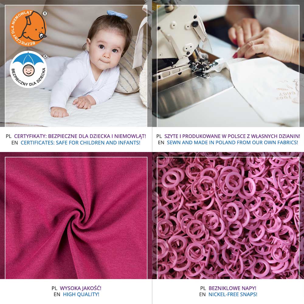 Baby-Halbstrampler – weiß Der weiche und druckfreie Halbstrampler ist die perfekte Wahl für die Kleinsten – von den ersten Lebenstagen an. Er ist aus hochwertigem, angenehm anzufassendem weißem Baumwollstrick gefertigt und bietet Tragekomfort und volle Bewegungsfreiheit. An der Taille befindet sich ein zarter Gummizug, der nicht auf den Bauch des Kindes drückt und für eine bequeme Passform sorgt. Der weiche Stoff schützt die Haut vor Reizungen und ist ideal für die empfindliche Haut von Babys. Warum sollten Sie sich für einen Eevi-Halbstrampler entscheiden? 100 % Baumwolle – ein natürliches, atmungsaktives Material, ideal für empfindliche Haut. Zarter Gummizug an der Taille – bequeme Passform ohne Druckstellen. Weicher Strickstoff – Komfort und Schutz vor Reizungen. Hergestellt in Polen – Liebe zum Detail und Qualität. Sicherheitszertifikat – geprüfte Qualität für Ihr Baby. Produkteigenschaften: Größen: 46, 48, 50, 56, 62, 68 Verwendungszweck: Für den Alltag / Ab den ersten Lebenstagen Farbe: Weiß Material: 100 % Baumwolle Materialart: Strickware Schnitt: Halbstrampler mit druckfreiem Bündchen an der Taille Verarbeitung: Weiches Gummiband an der Taille Pflege: Waschen bei 40 °C, nicht im Wäschetrockner trocknen Herkunft: 100 % polnisches Produkt Zertifikate: „Sicher für Kinder” Komfort und Sicherheit von den ersten Tagen an Eevi ist eine Marke, die speziell für die Kleinsten entwickelt wurde. Alle unsere Kleidungsstücke werden in Polen aus zertifizierten Materialien unter Einhaltung höchster Qualitätsstandards genäht. Wir setzen auf weiche Verarbeitungen, bequeme Schnitte und die vollständige Sicherheit jedes Kleidungsstücks. Setzen Sie auf Qualität – wählen Sie einen Eevi-Halbstrampler.