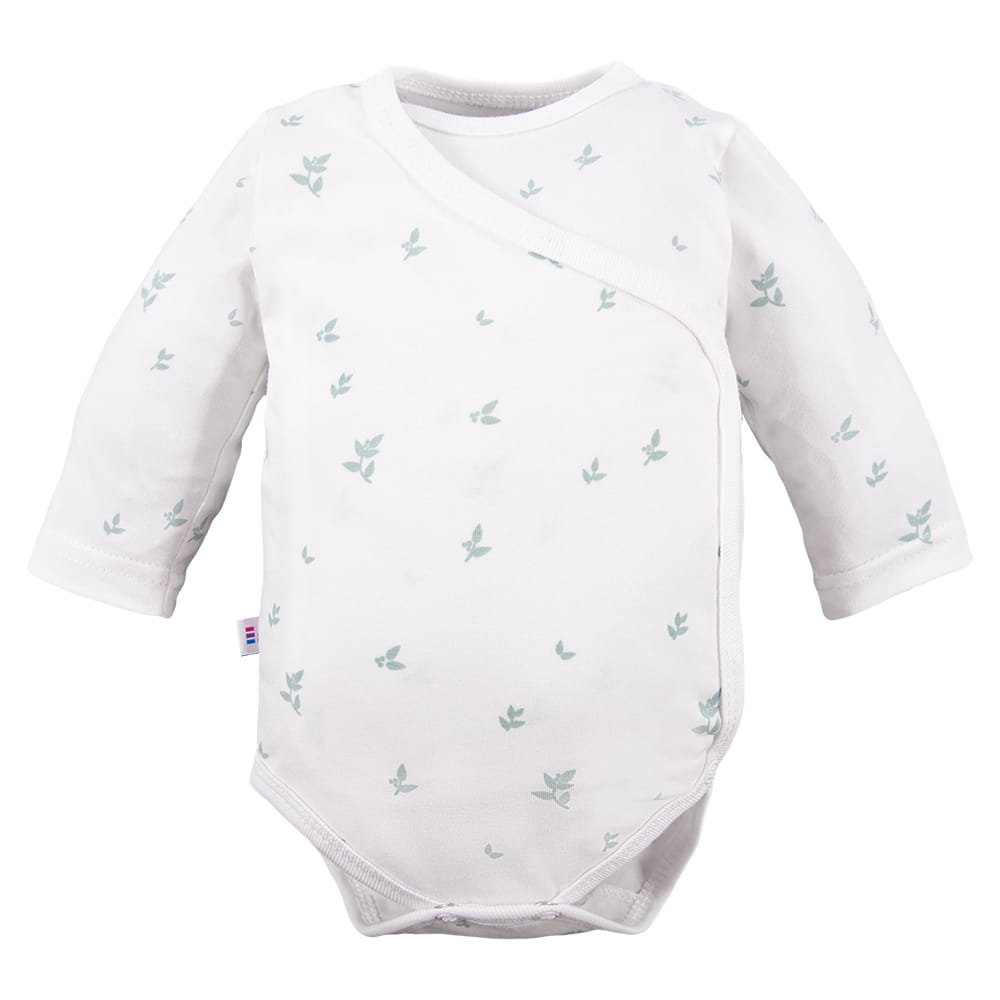 Weißer Langarm-Wickelbody mit zarten grünen Blättern ist eine funktionale und bequeme Wahl für Babys in den ersten Monaten. Das dezente Blättermuster verleiht dem Body einen freundlichen und eleganten Charakter.