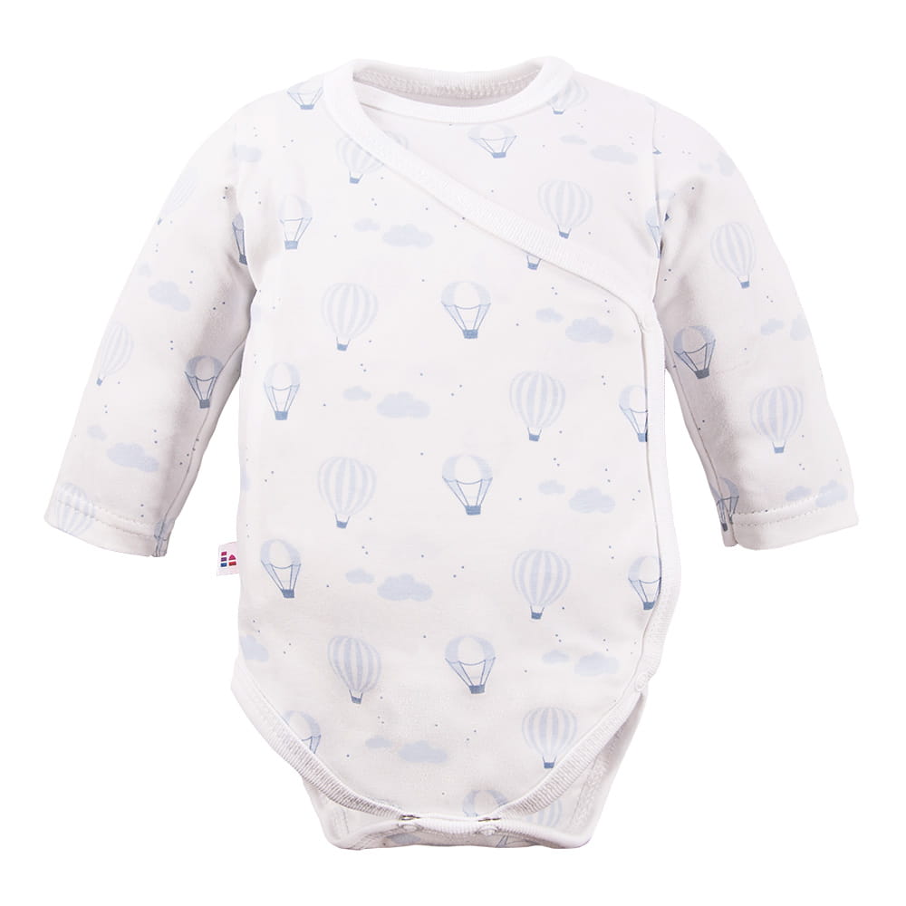 Weißer Wickelbody mit langen Ärmeln und niedlichem Ballonmuster – die perfekte Wahl für Babys in den ersten Lebensmonaten. Das zarte Design verleiht dem Body einen besonders liebevollen Charakter.