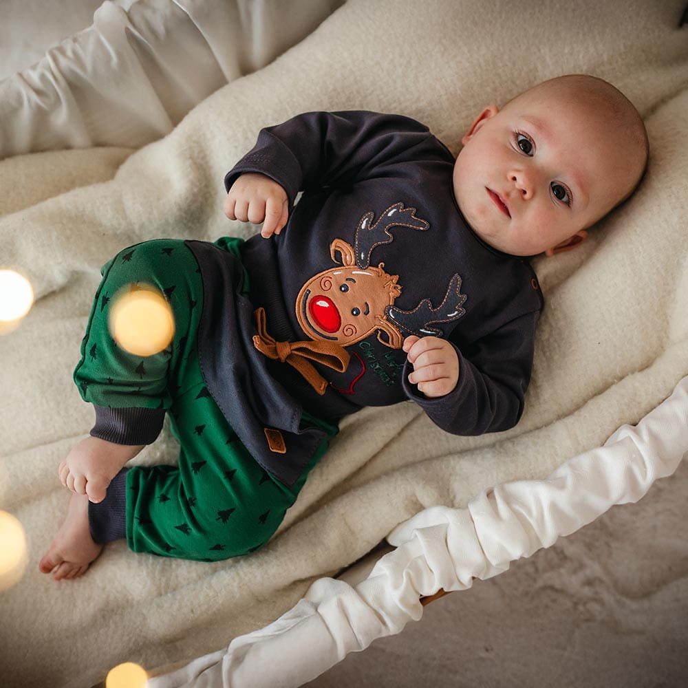 Ein bezauberndes Weihnachtsset für die Kleinsten, gefertigt aus weicher, hautfreundlicher Baumwolle. Das Set besteht aus einem Body mit zarter Rentierstickerei sowie einer bequemen grünen Hose – die perfekte festliche Kombination. Ideal für Familientreffen, Weihnachtsfotos und magische Wintertage.Warum Sets von Eevi wählen?