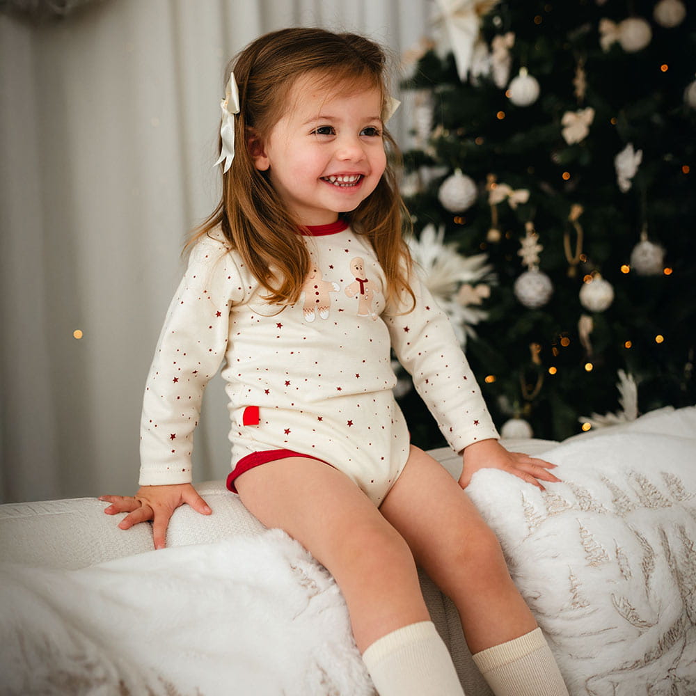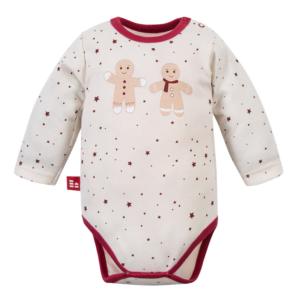 Baby bodysuit ecru with burgundy Christmas stars and gingerbread cookies