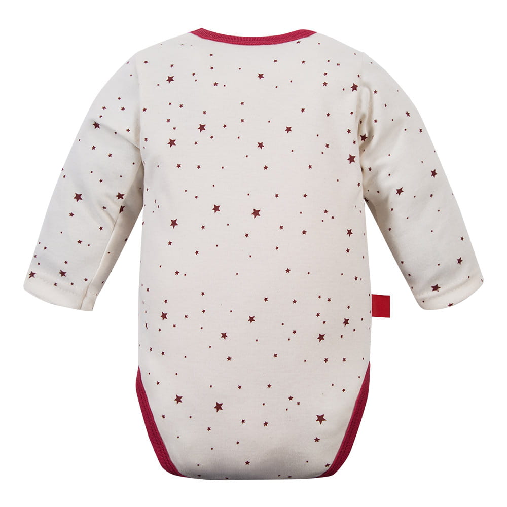 This baby bodysuit in ecru with a charming Christmas print featuring burgundy stars and gingerbread cookies is the perfect choice for winter days and family celebrations. Soft, natural 100% cotton ensures full comfort, while the burgundy trims add an elegant finish. The bodysuit is available in sizes 74–98, making it easy to choose the perfect fit for your child.